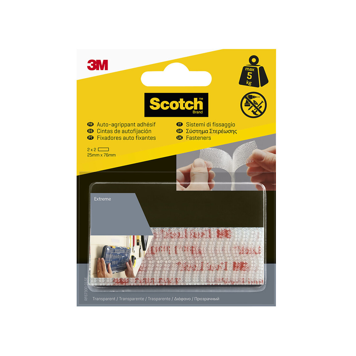 Bande Agrippante Adhésive extrême Transparent 7,6cm x 25mm - Les auto-agrippant adhésifs de la gamme Scotch se déclinent en plusieurs formes et dimensions pour permettre une facilité au quotidien. Chaque produits sont pensés pour une utilisation précise. Du rouleau agrippant à la pastille, vous avez la possibilité de choisir le produit qui correspond à vos besoins. Simple d’utilisation, les clous, vis et autres matériaux ne sont pas nécessaire à la fixation. Les auto-agrippant de la gamme Scotch se fixent solidement et facilement sur différente surface (lisse, peinte, métal, béton). La famille Extrême des auto-agrippant est idéale pour accrocher des éléments jusqu’à 5kg.Spécifications techniques