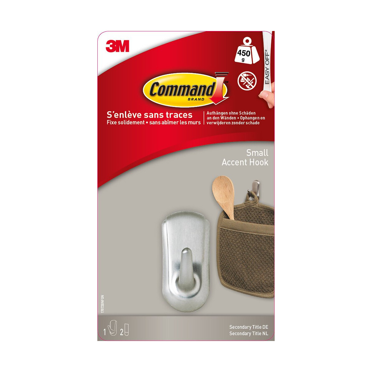 Crochet Accent Command™ aspect métal petit modèle avec 2 languettes de fixation adhésives enlevables - Charge maximale supportée : 450g - Les crochets décoratifs Command™ se présentent sous plusieurs styles différents, sophistiqués, ils s'adaptent à plusieurs types de pièce et aux goûts de chacun. Fini les clous, les vis et les punaises, les crochets Command™ s'accrochent solidement et facilement sur différents supports (surfaces peintes, en bois, carrelées, et plus encore ...). De plus, ils s'enlèvent proprement en ne laissant ni trou, ni marque, ni résidu collant. Si vous souhaitez déplacer les crochets, il suffit d'appliquer une nouvelle languette adhésive Command™ qui vous permettra de les fixer et les réutiliser à volonté !Spécifications techniques