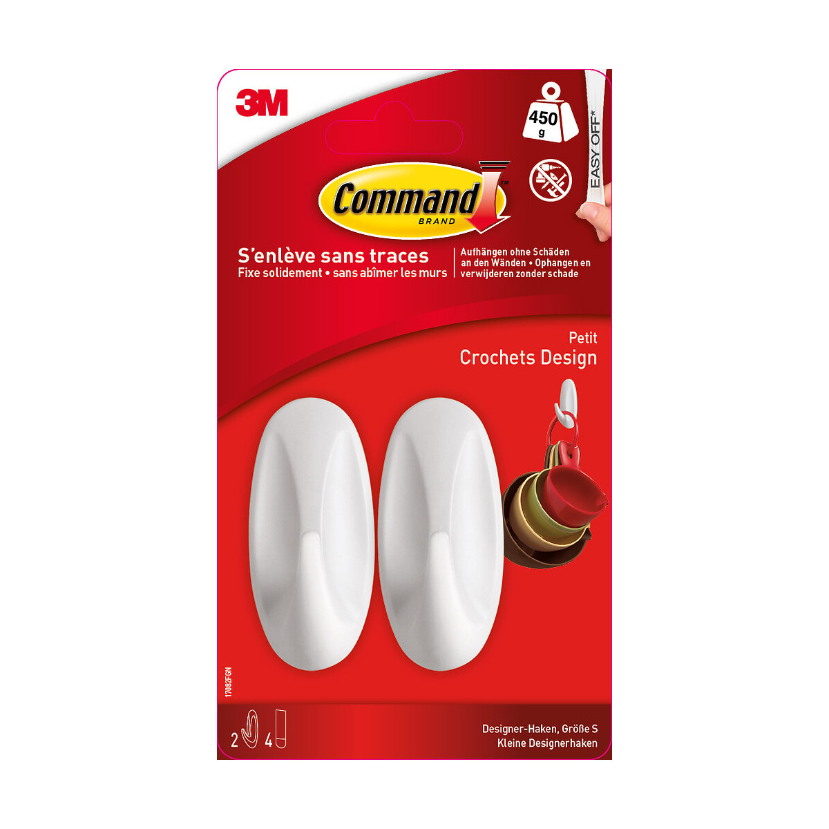 2 crochet plastique design blanc COMMAND petit modèle avec 4 languettes de fixation adhésives enlevables - Charge maximale supportée : 450g - Fini les clous, les vis et les punaises, les crochets Command™ s'accrochent solidement et facilement sur différents supports (surfaces peintes, en bois, carrelées, et plus encore ...). De plus, elles s'enlèvent proprement en ne laissant ni trou, ni marque, ni résidu collant. Si vous souhaitez déplacer les crochets, il suffit d'appliquer une nouvelle languette adhésive Command™ qui vous permettra de les fixer et les réutiliser à volonté !Spécifications techniques