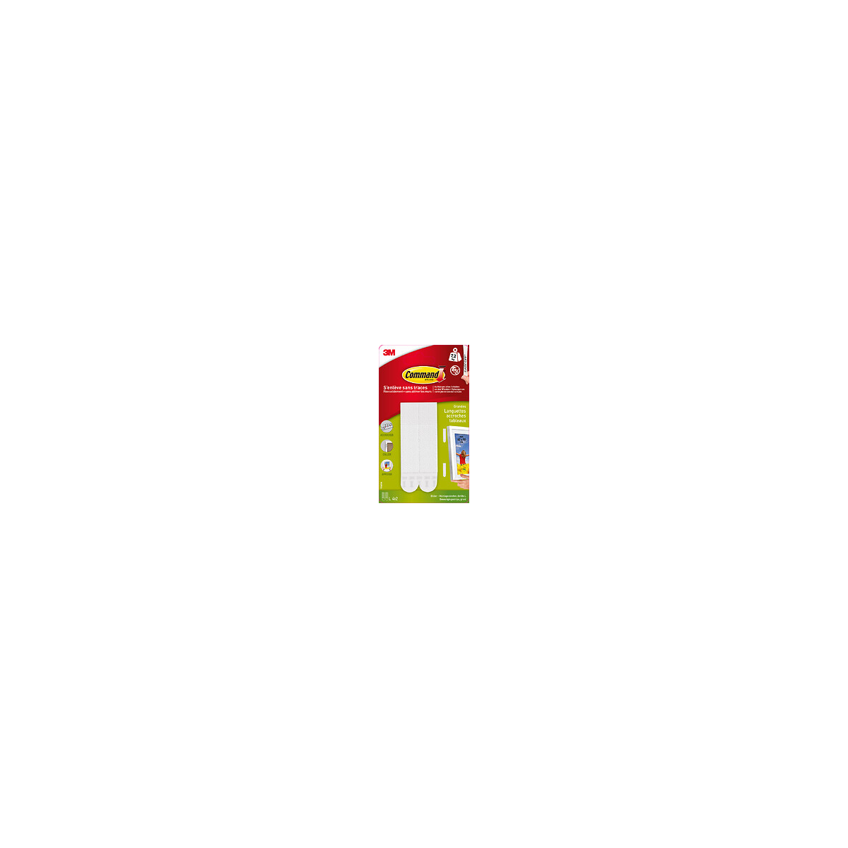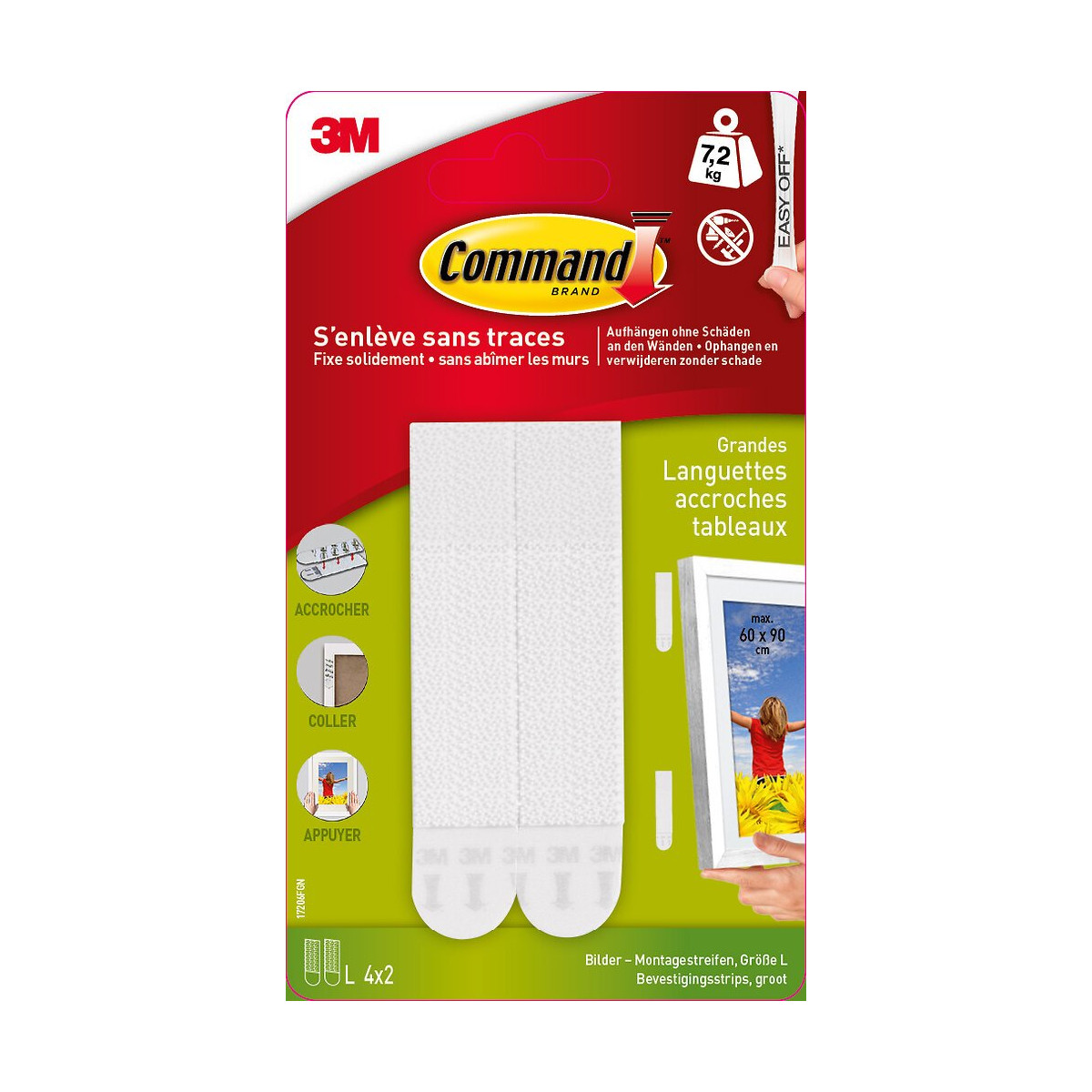 4 paires de 2 languettes de fixation adhésives enlevables tableau grand modèle blanc - Charge maximale supportée : 7,2 kg - Avec la technologie Command™, oubliez les clous, vis, punaises qui abîment les murs ! Les languettes adhésives Accroches Tableaux Command™ permettent de fixer les cadres, simplement et solidement, sans outil, sans trou et sans trace. De plus, elles permettent la fixation des tableaux sur de nombreux supports (carrelage, murs peints, mélaminé, inox ...). Le système de fermeture en picots Command™ permet de fixer solidement mais aussi de décrocher et repositionner les cadres à volonté, favorisant selon vos envies et besoins une décoration nomade et ludique. Lorsque vous êtes prêts à retirer ou déplacer vos tableaux, elles se retirent proprement , pas de trous, de marques ou de résidus collants.Spécifications techniques