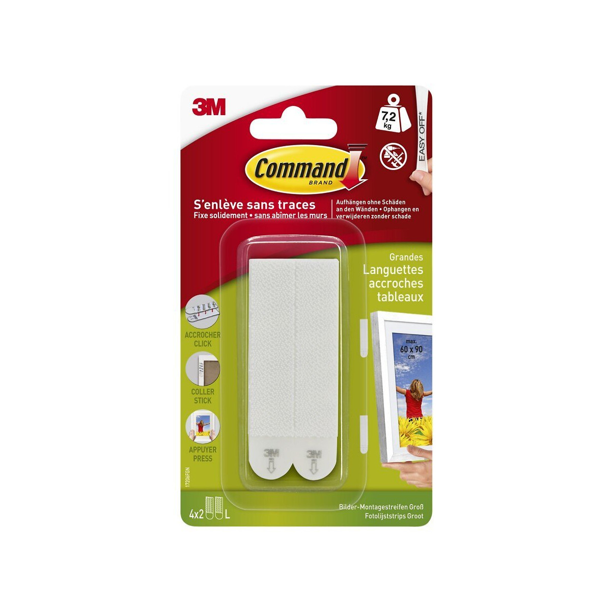 "Accrocher. Décorer. Sans Abîmer les murs. Lorsque vous êtes prêts à retirer ou déplacer vos tableaux, les languettes Command™ se retirent proprement ; pas de trous, de marques ou de résidus collants. Fixer sans outil, sans trou et sans trace." Avec la technologie Command™, oubliez les clous, vis, punaises qui abîment les murs ! Les languettes adhésives Accroches Tableaux Command™ grand modèle permettent de fixer les cadres, simplement et solidement jusqu'à 7,2kg, sans outil, sans trou et sans trace. De plus, elles permettent la fixation des tableaux sur de nombreux supports (murs peints, carrelage, mélaminé, verre, métal, plastique...). Le système de fermeture en picots Command™ permet de fixer solidement et aussi de décrocher et repositionner les cadres à volonté, favorisant selon vos envies et besoins une décoration nomade et ludique. Type de produit: Lot de 8 languettes de fixation Poids supporté maximum (en kg): 7.2 Usage du produit: Fixer au mur sans percer Type de pose: Adhésif Couleur: Blanc Matière de la platine: Plastique Matière principale: Plastique / PVC Produit emballé : hauteur (en cm): 17 Produit emballé : largeur (en cm): 9.7 Produit emballé : profondeur (en cm): 1.7 Produit emballé : poids (en kg): 0.018 Indication du geste de tri (triman): Nos produits et emballages peuvent faire l'objet d'une consigne de tri. Pour en savoir plus : www.quefairedemesdechets.fr