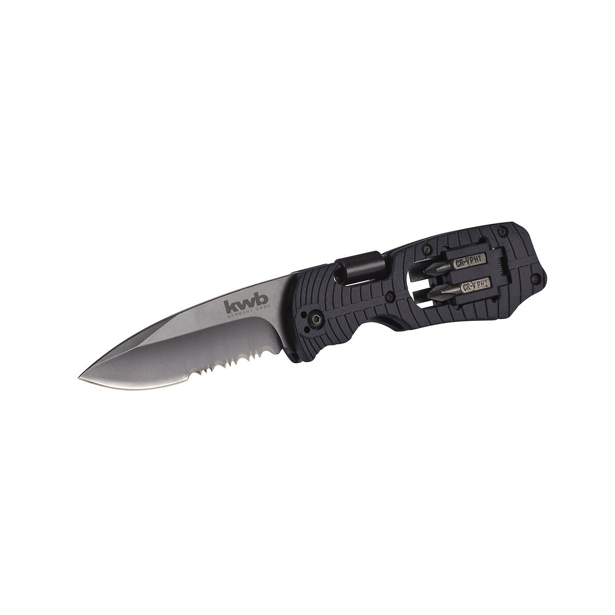 Lame de 80 mm aiguisée - Verrouillage de la lame - Porte-embout dépliable avec échelle de mesure - 4 embouts en acier CV, PH1, PH2 ET PZ1 - Fente à 4 mm - Clip de ceinture pratique et décapsuleur