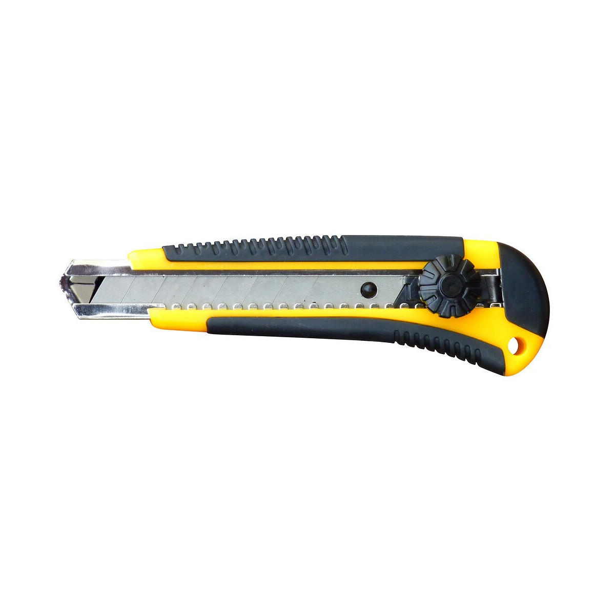 Corps en plastique avec grip confort antidérapant. Glissière renforcée en acier chromé. Bouton de blocage à molette pour une serrage de lame puissant. Casse lame intégré. Largeur : 18 mm