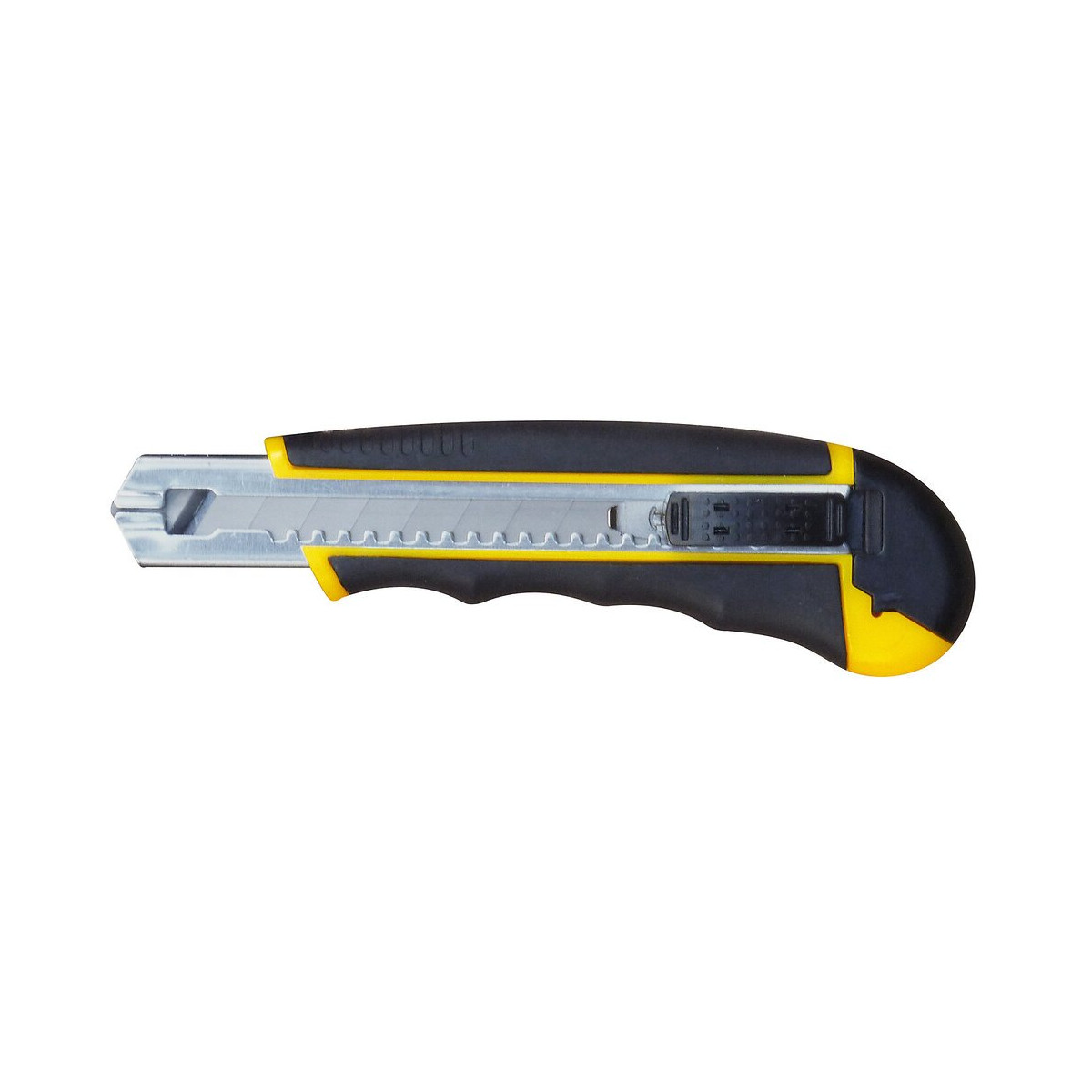 Corps en plastique avec grip confort antidérapant. Glissière renforcée en acier chromé. Bouton à blocage automatique, chargeur automatique de 6 lames dans le manche (livré avec 6 lames au total). Largeur : 18 mm