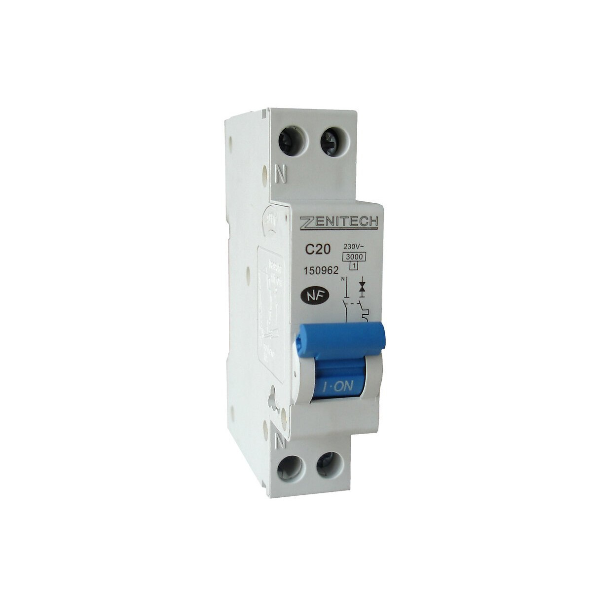 Ce disjoncteur phase sans neutre 20A ZENITECH protège le circuit électrique afin d'éviter tout échauffement ou court-circuit et prévenir des risques d'incendie. Ampérage : 20A. Tension : 230V. Pouvoir de coupure : 3kA.