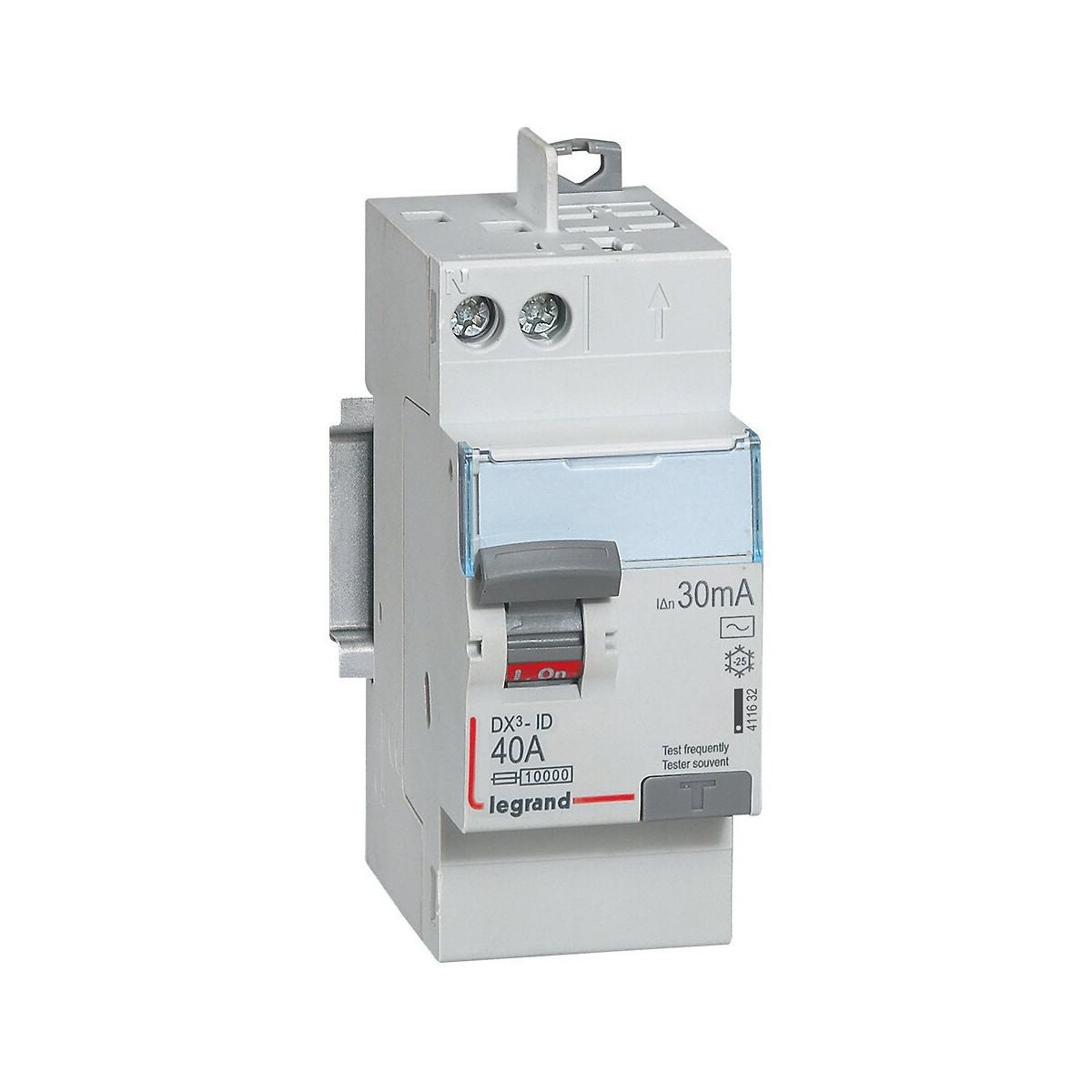 Interrupteur différentiel DX³-ID 2P type AC 30mA arrivée haut/départ haut 40A. L'interrupteur différentiel détecte les fuites de courant dues à des défauts d'isolement et prévient tous risques d'électrocution en coupant immédiatement l'alimentation du circuit concerné lors d'un contact accidentel avec le courant.