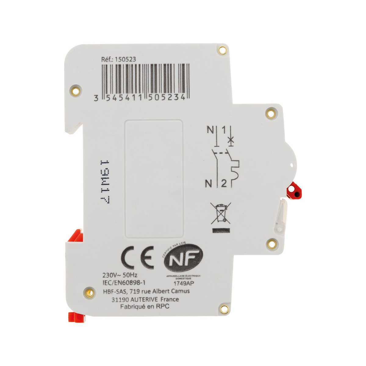 Disjoncteur à vis PH+N - 20A NF - Pouvoir de coupure 4.5KA - Thomson Avec sa gamme de disjoncteurs certifiés NF, Thomson assure la protection des biens et des appareils de commande contre les surtensions. Ce disjoncteur à vis phase + neutre dispose d'une puissance de 20A et d'un pouvoir de coupure de 4.5KA. Caractéristiques: Puissance: 20A Pouvoir de coupure de 4.5KA Indicateurs ON/OFF mécanique avec marquage sur la manette Tension assignée 230 V~/50Hz Bornes à vis.