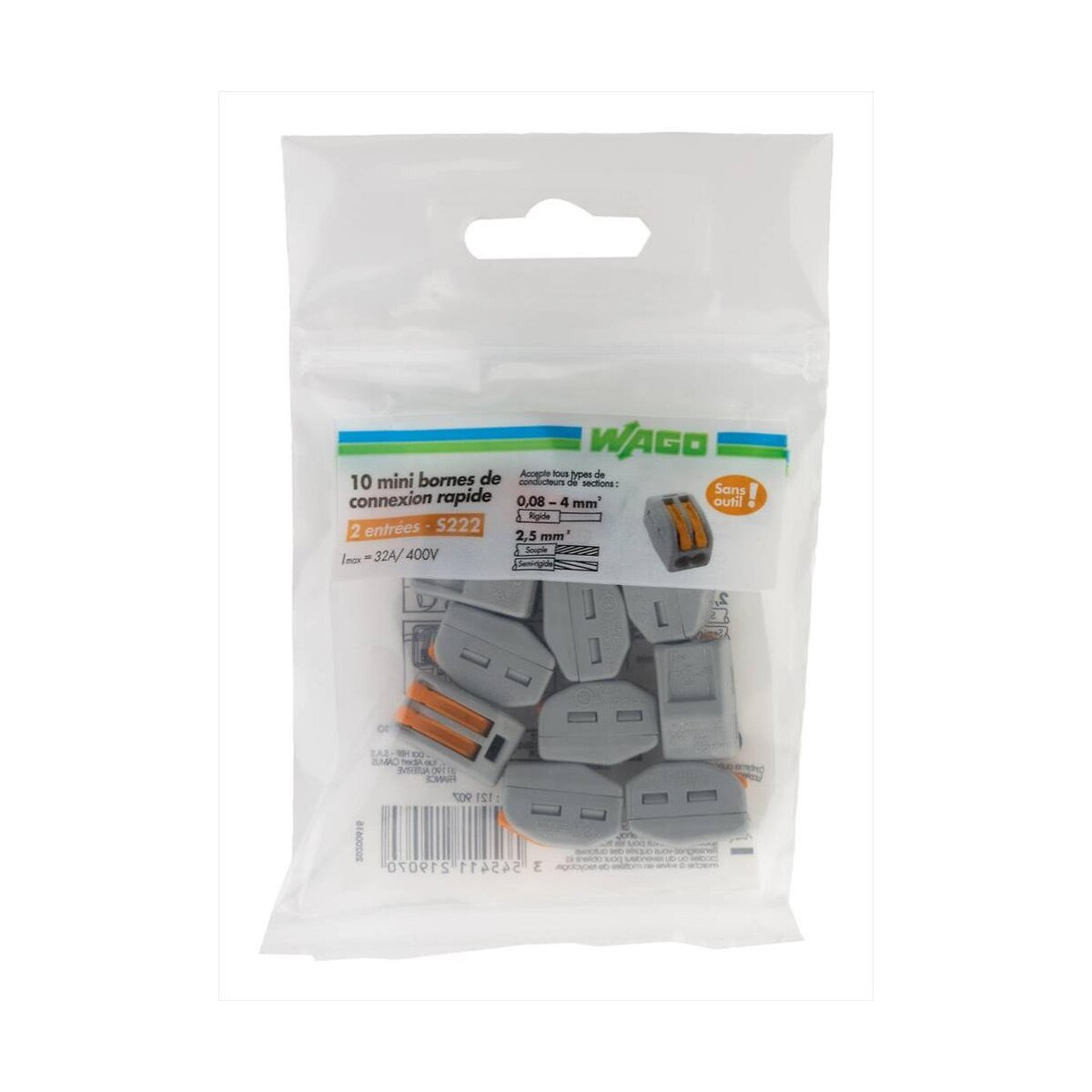 C'est un lot de bornes rapides pour les fils souples ou rigides jusqu'à 2,5mm² WAGO 10 BORNES S222 2FILS 2.5MM² Composition de l'assortiment: WAGO 10 BORNES S222 2FILS 2.5MM² Type de câble: Rigide et souple Section du câble (en mm²): 2,5 Produit emballé : hauteur (en cm): 14 Produit emballé : largeur (en cm): 9 Produit emballé : profondeur (en cm): 1 Produit emballé : poids (en kg): 0.037 Indication du geste de tri (triman): Nos produits et emballages peuvent faire l'objet d'une consigne de tri. Pour en savoir plus : www.quefairedemesdechets.fr