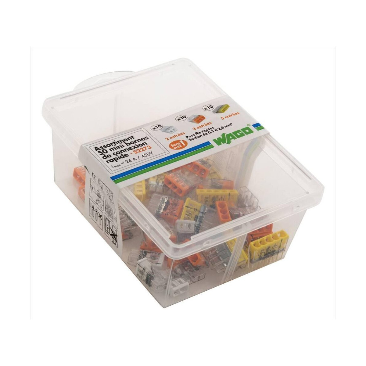 C'est un lot de bornes rapides pour les fils rigides jusqu'à 2,5mm² WAGO 50 BORNES S2273 10x2-30x3-10x5 FILS 2.5² Composition de l'assortiment: WAGO 50 BORNES S2273 2-3-5 FILS 2.5² Type de câble: Rigide Section du câble (en mm²): 2,5 Produit emballé : hauteur (en cm): 12 Produit emballé : largeur (en cm): 9 Produit emballé : profondeur (en cm): 5.2 Produit emballé : poids (en kg): 0.1 Indication du geste de tri (triman): Nos produits et emballages peuvent faire l'objet d'une consigne de tri. Pour en savoir plus : www.quefairedemesdechets.fr
