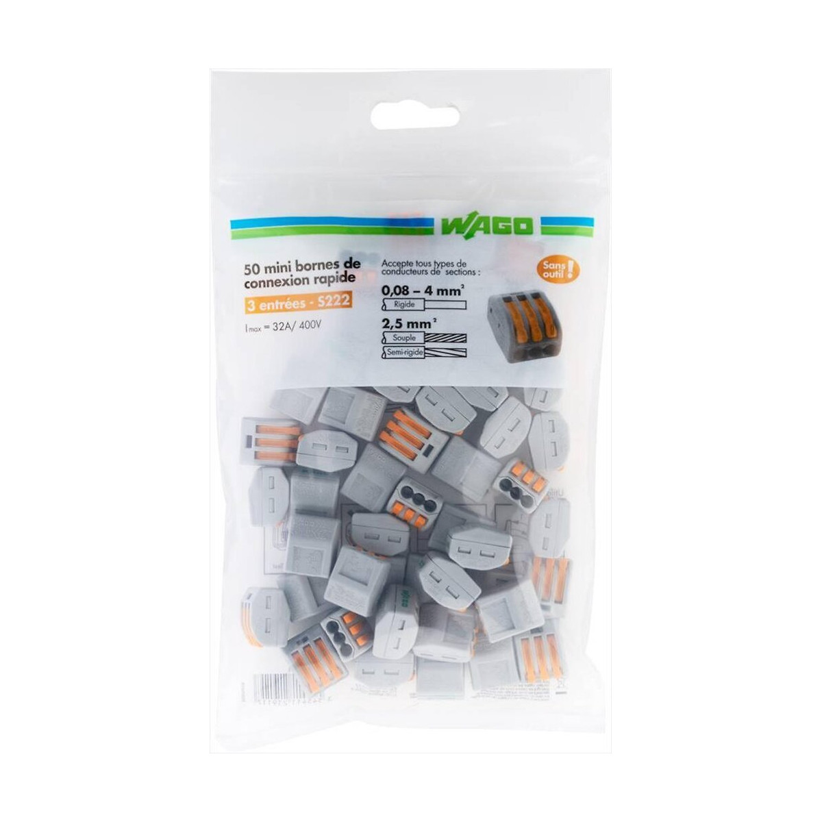 C'est un lot de bornes rapides pour les fils souples ou rigides jusqu'à 2,5mm² WAGO 50 BORNES S222 3FILS 2,5MM² Composition de l'assortiment: WAGO 50 BORNES S222 3FILS 2,5MM² Type de câble: Rigide et souple Section du câble (en mm²): 2,5 Produit emballé : hauteur (en cm): 23 Produit emballé : largeur (en cm): 14 Produit emballé : profondeur (en cm): 3 Produit emballé : poids (en kg): 0.24 Indication du geste de tri (triman): Nos produits et emballages peuvent faire l'objet d'une consigne de tri. Pour en savoir plus : www.quefairedemesdechets.fr