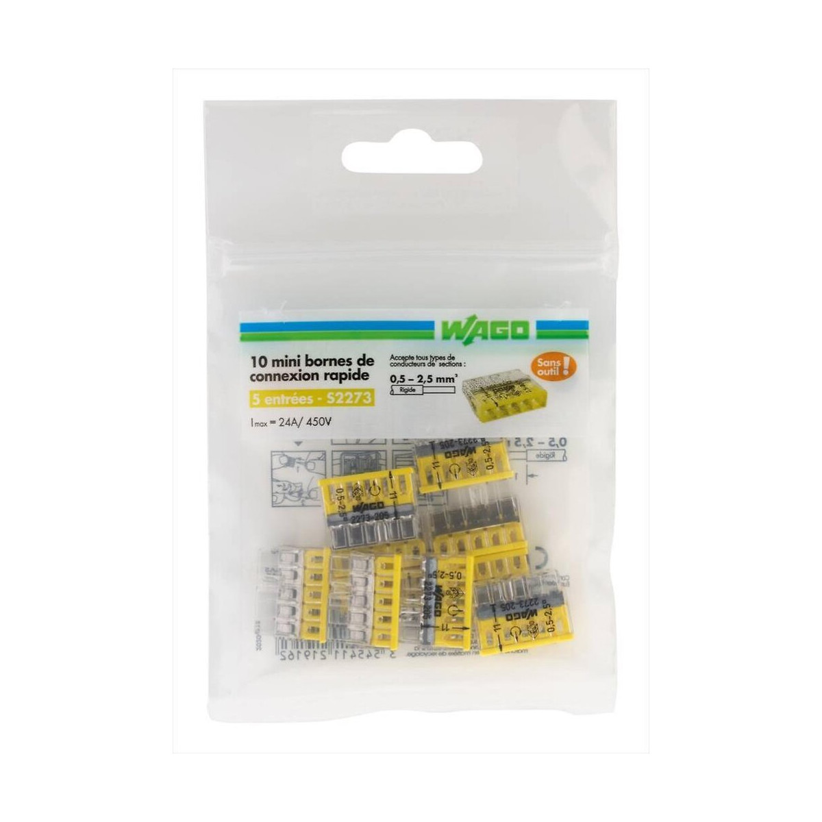 C'est un lot de bornes rapides pour les fils rigides jusqu'à 2,5mm² WAGO 10 BORNES S2273 5FILS 2.5MM² Composition de l'assortiment: WAGO 10 BORNES S2273 5FILS 2.5MM² Type de câble: Rigide Section du câble (en mm²): 2,5 Produit emballé : hauteur (en cm): 14 Produit emballé : largeur (en cm): 9 Produit emballé : profondeur (en cm): 1 Produit emballé : poids (en kg): 0.019 Indication du geste de tri (triman): Nos produits et emballages peuvent faire l'objet d'une consigne de tri. Pour en savoir plus : www.quefairedemesdechets.fr