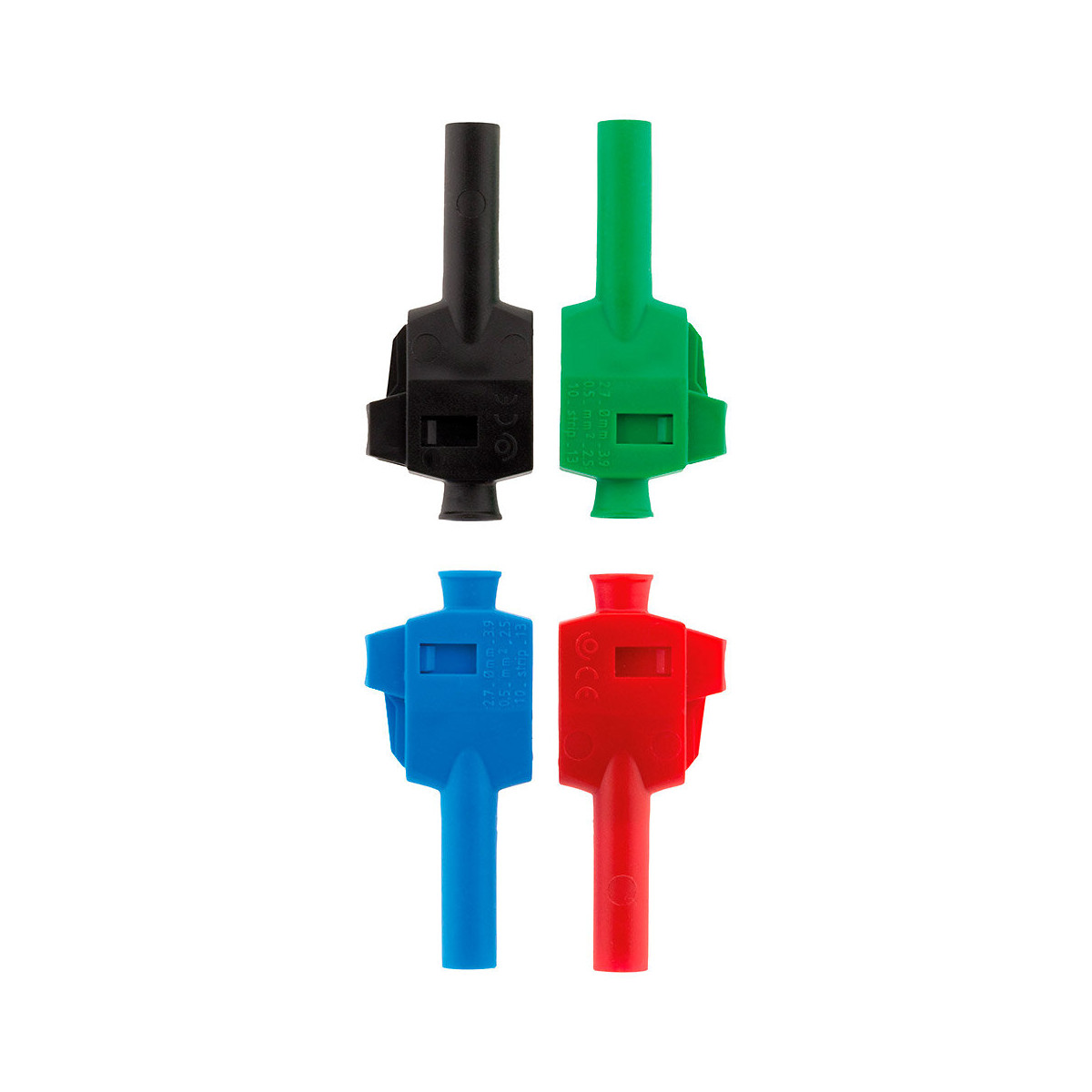 Lot de 4 fiches mâles de sécurité à raccordement rapide Composition du lot: 1 rouge + 1 noire + 1 bleue + 1 verte Caractéristiques: Intensité admissible 20A. Tension de service 600V.