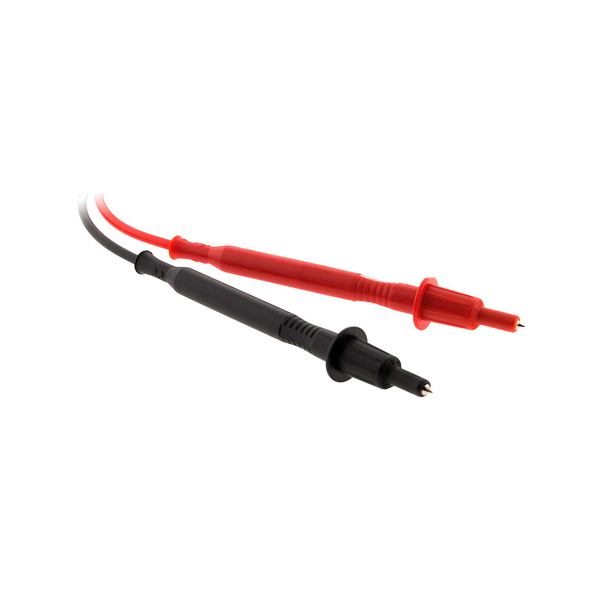 Lot de 2 cordons pointe de touche avec fiche coudée pour multimètre: 1 rouge + 1 noir. Diamètre 4mm. Intensité admissible 20A. Tension de service 1000V. Certifié CE