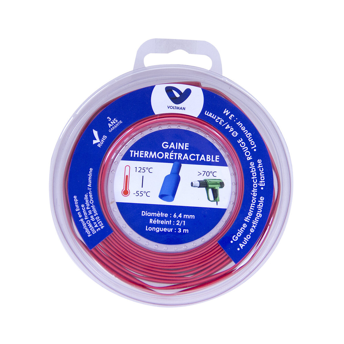 Gaine thermorétractable en dévidoir sans adhésif, HIS PACK, Polyoléfine réticulée (PO-X). Caractéristiques : Gaine thermoratractable Ø 6,43,4mm X 5 mètres, auto-extinguible, rouge, étanche, température d'utilisation -55 /+ 125?C.Spécifications techniques