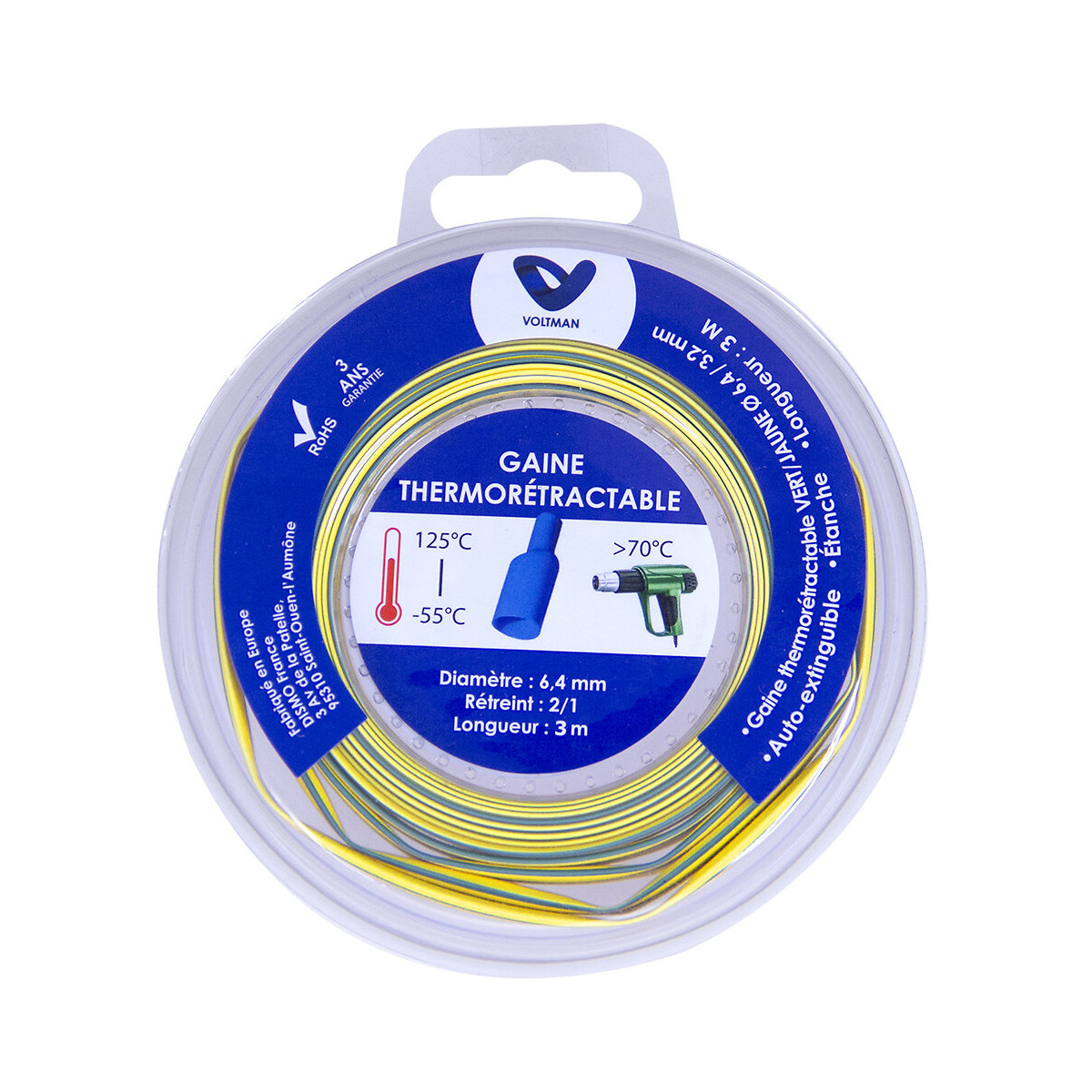 Gaine thermorétractable Ø 6,4/3,4mm X 5 mètres auto-extinguible, vert/jaune, etanche, température d'utilisation -55 /+ 125?C., résistant aux UV - haute flexibilité - A faible emission de fumée lors de la combustionSpécifications techniques