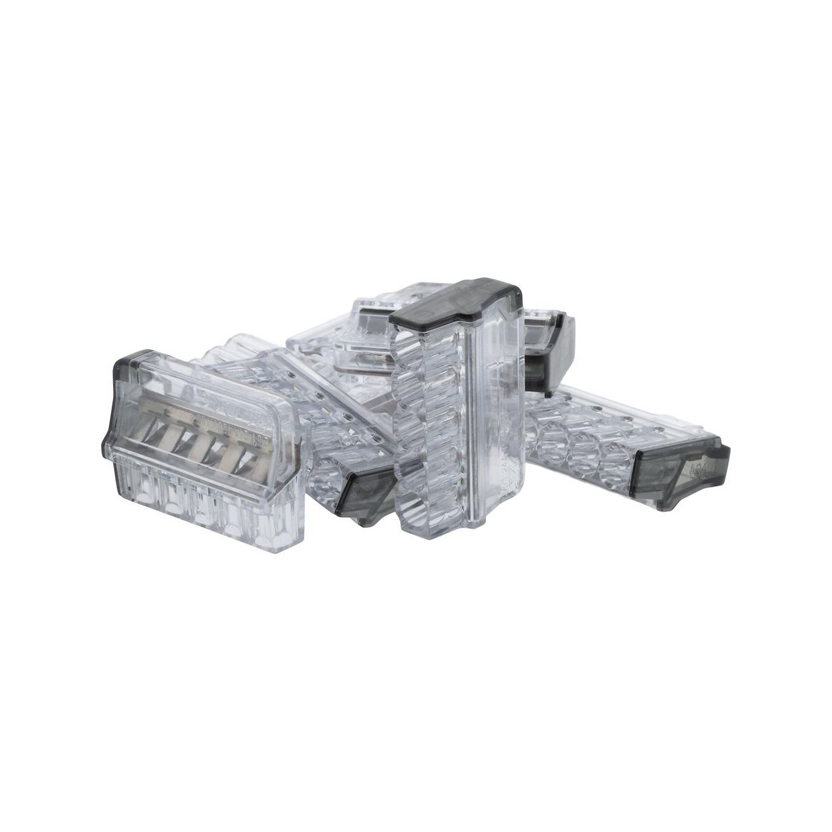 Eaton CAPRI vous propose une large gamme de connecteurs électriques pour fils rigides, semi rigides et souples. Conditionnés par pot de 100 unités, ces connecteurs Slim 5 entrées offrent plusieurs avantages. Les connecteurs Slim s'utilisent avec des fils rigides de 0,5 à 2,5 mm² et disposent des mêmes caractéristiques techniques que les connecteurs standard. Ils sont 30% plus petits que les connecteurs standard et vous assurent un véritable gain de place dans les endroits exigus ainsi qu'un meilleur confort de câblage. Caractéristiques : Corps transparent en polycarbonate UL 94 V0, Pour fils rigides de 0.5 à 2.5 mm², Résistance au fi l incandescent : 960°C, Tension maxi : 450 V, Intensité maxi : 24A, Présence d?un point de test, normes EN 60998-1 et EN60998-2-2.