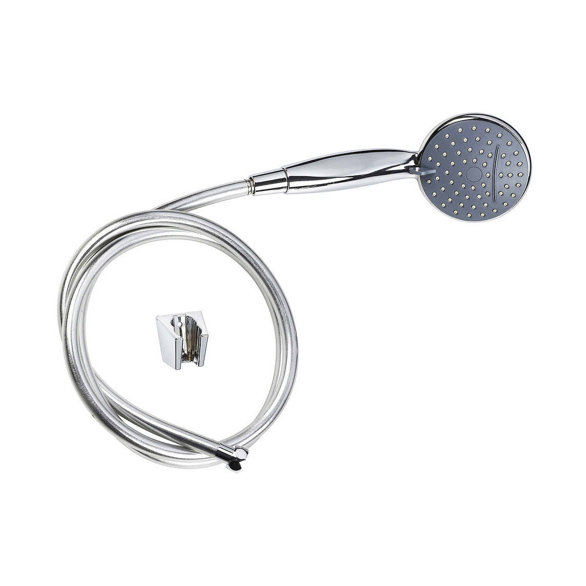 * Douchette : - diamètre : 110 mm - nombre de jets : 2 (pluie, lamellaire) - matière : ABS chromé - anti-calcaire : picots souples - économie d'eau : joint réducteur de débit + position stop'o (fonction stop'o par curseur) * Flexible : - matière : PVC lisse argenté - longueur : 1,75 m - raccordement : écrous metal F1/2 (15x21) - résistance à la traction : 25 kg - écrou anti-torsion * Support : - mural fixe 2 positions - matière : ABS chroméSpécifications techniques