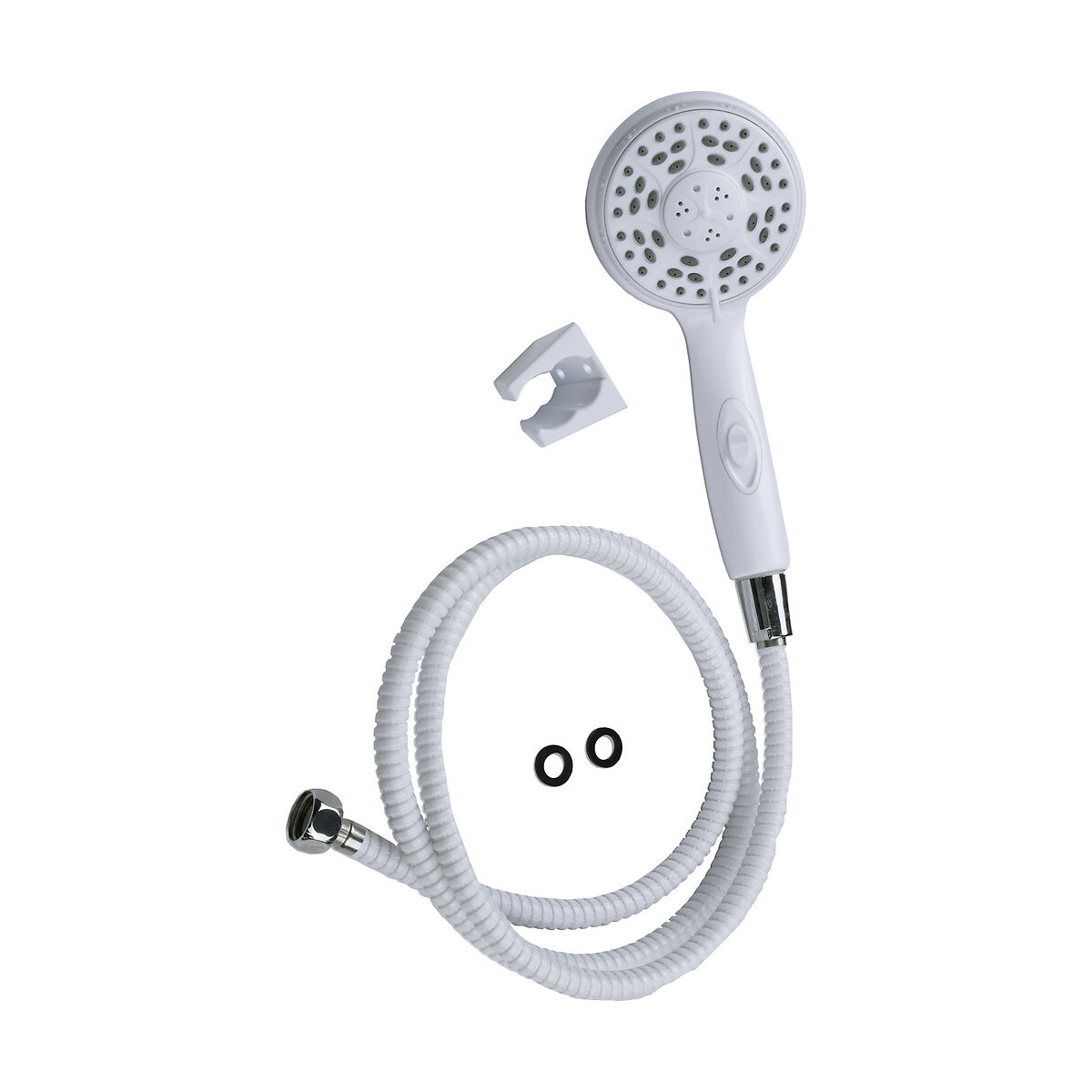 Kit douchette support 3 jets blanche -ABS, finition blanche - dia.100mm, 3 jets (Pluie, massage, tonique avec goutte d’eau) - corps blanc, plaque blanche avec buse gris foncé, et bouton blanc - Flexible en PVC renforcé blanc, 1,75m, connecteur ANTI-TWIST - Écrou métallique conique G1/2 et écrou métallique G1/2, avec insert en laiton. Support mural : ABS, blanc,2 positions