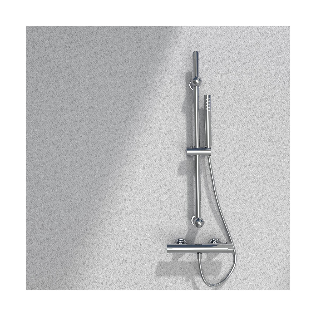 L'ensemble de douche Una chromé se révèlera être un réel atout pour votre salle de bain. Ce kit chromé est certifié ACS et est garanti 2 ans ! DOUCHETTE : - Douchette chromée en ABS. - Douchette 1 jet de type pluie. - Avec picots anticalcaires en silicone pour un nettoyage facile. - Valve limiteur de débit. - Barre de douche inox chromée : Longueur 765 mm, diamètre 25 mm - Coulisseau en ABS - Flexible inox double agrafage 150 cm NORMES : - Certification ACS : Accréditation de Conformité Sanitaire. GARANTIE : Nos produits sont garantis de 2 ans contre tout vice de fabrication, la date d’achat faisant foi et 1 an concernant l’état de surface. Notre responsabilité ne peut être engagée dans les cas suivants : - Installation ou usage impropre du produit. - Utilisation de produits d’entretien non adaptés (corrosifs, abrasifs, solvants, acides, etc…) - Dommages quels qu’ils soient ; occasionnés par la présence de corps étrangers véhiculés par l’eau (sable, limaille, etc…) ou par une température excessive de celle-ci. - Dommages occasionnés par le gel. - Dommages occasionnés par une chute. - Dommages liés à un défaut d’entretien et à un manque de soin manifeste ayant entraîné un encrassement anormal du produit, des chocs, etc… Conseils d'entretien : Il est conseillé de nettoyer le produit avec une solution savonneuse, ne jamais utiliser de substances acides ou abrasives. Les taches de calcaire peuvent être évitées en séchant la robinetterie après son utilisation. Pour éviter les obstructions dues au calcaire il est conseillé de l’immerger 1 à 3 heures dans de l’eau avec du vinaigre blanc.Spécifications techniques