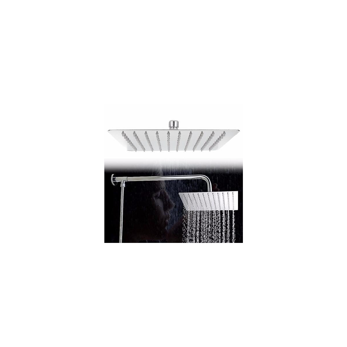 ""Pomme de douche ultra-mince"" Pomme de douche carrée ultraslim, élégante et essentielle, en acier inoxydable chromé 20 cm x 20 cm. Profitez de votre temps de douche avec cette pomme de douche à effet pluie. Il dispose d'un raccord 1/2 qui permet de l'installer dans n'importe quelle douche et est également anticalcaire. Il possède, en effet, des tétines en silicone qui facilitent le nettoyage du calcaire et, par conséquent, en prolongent la durée dans le temps. DÉTAILS : Mesure 20x20 cm Matériau acier inoxydable Connexion 1/2 Design standard Idéal pour robinets de douche Finition chromé