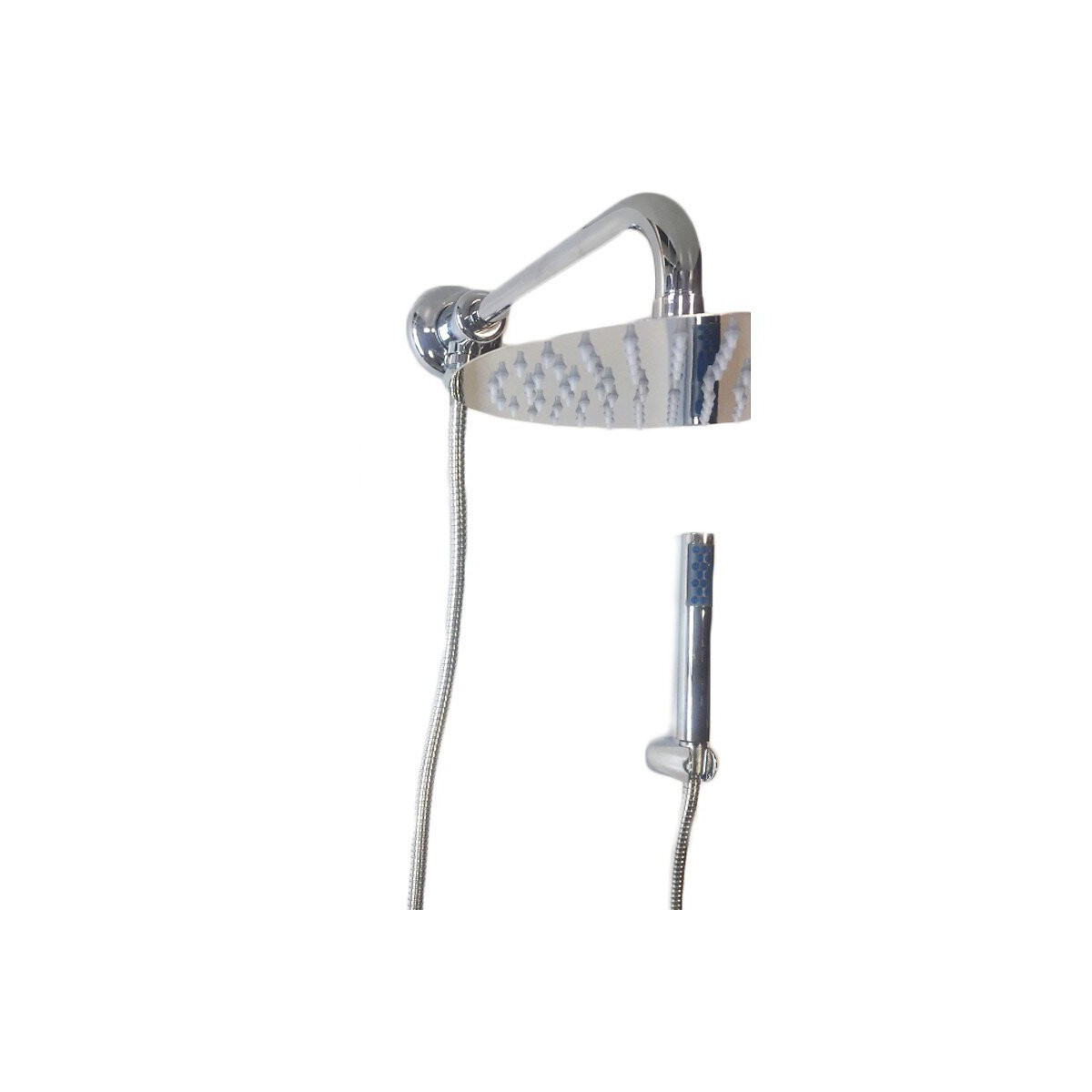 "simple et moderne ! Ensemble de douche composé par : Déviateur à bouton-poussoir "Foxy". Bras de douche en laiton de 25 cm Pomme de douche ronde de 20 cm de diamètre Flexible de douche Douche à main ronde minimaliste Support de douche fixe avec fixations