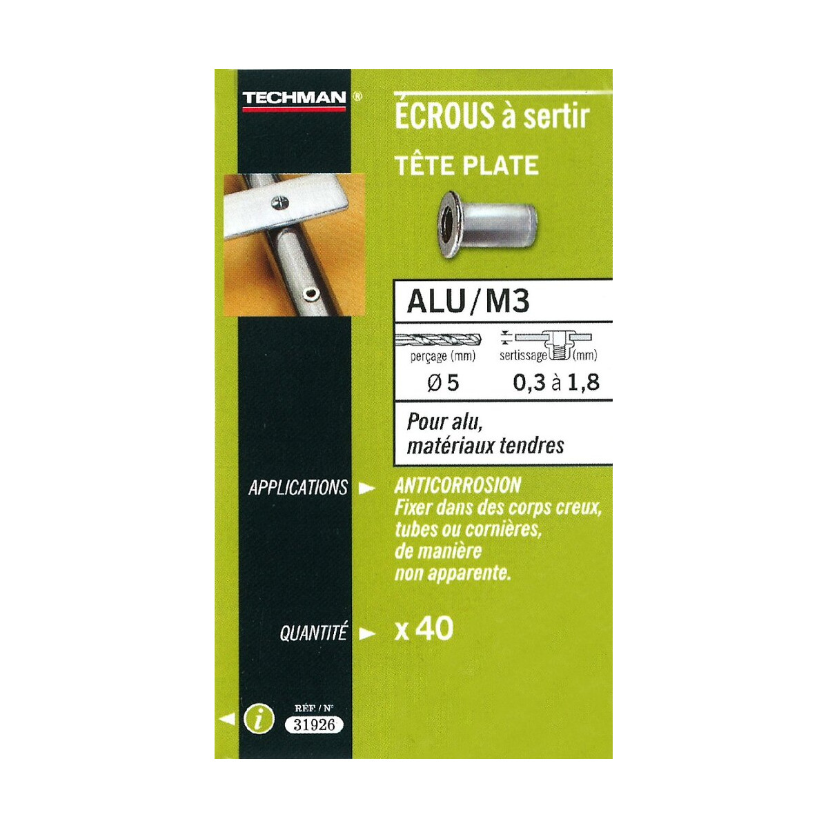 40 écrous M4 à sertir alu avec tête plate. Epaisseur à sertir : 3 mm, longueur filetage : 6 mm. Rivets creux taraudés pour fixation démontable sur les toles, tubes, cornières, …