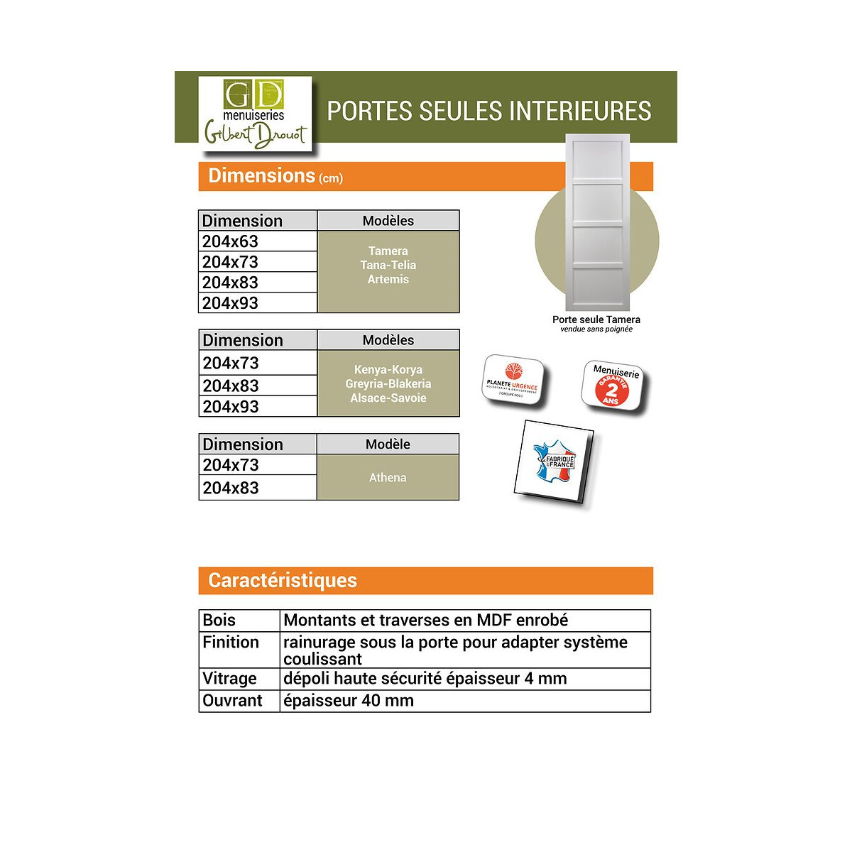 porte 204 x 73 en mdf enrobé gris anthracite ral 7016 vitrage dépoli 4 mm sécurit OUVRANT DE 40 mm D'EPAISSEUR RAINURAGE POUR GUIDAGE OUVERTURE COULISSANTE rail en aluminum vendu avec la porte. 2 coquilels posées sur la porteSpécifications techniques