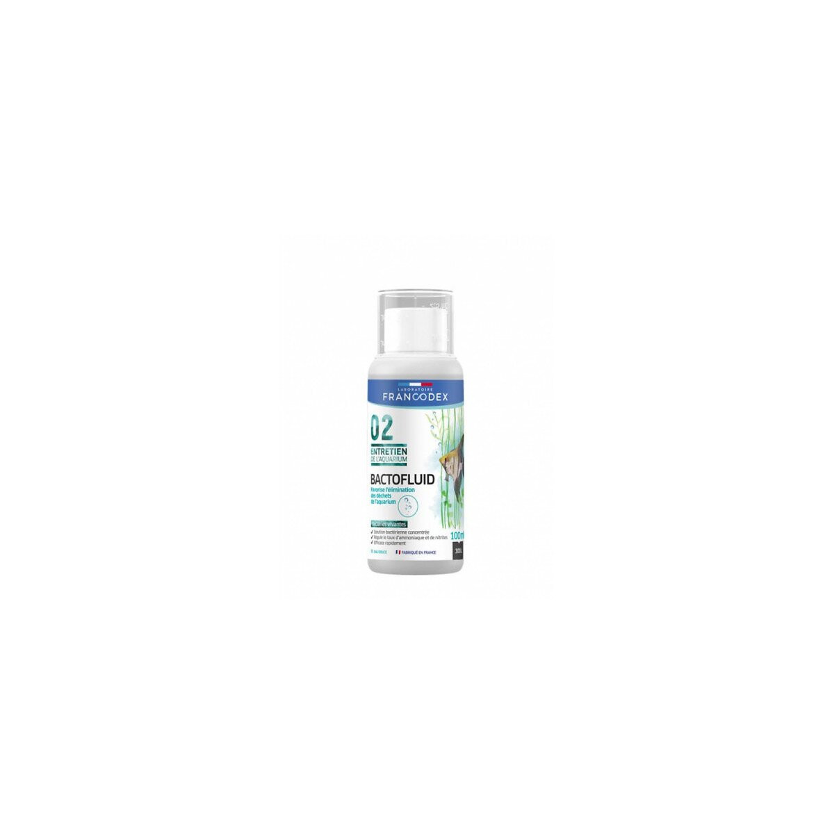 BACTOFLUID 100ML BACTÉRIES ANTI-NITRITES LIQUIDES LES + PRODUITS - Solution bactérienne concentrée - Régule le taux d'ammoniaque et de nitrites - Efficace rapidement Dans l'aquarium, les déchets produits par les poissons sont utilisés par les bactéries présentes, qui peuvent produire des composés toxique ( nitrates, nitrites). BACTOFLUID, grâce a son apport de bactéries nitrifiantes, permet de limiter la production de ces composés toxique et maintenir l'équilibre du cycle de l'azote de l'aquarium. Bactéries vivantes - Favorise l'élimination des déchets de l'aquarium. Mode d'emploi Agiter avant utilisation. À chaque changement d'eau et après chaque traitement des poissons : verser 10 ml de BACTOFLUID pour 30 litres d'eau. Photo non contractuelle, car il y a plusieurs vendeurs sur une même fiche produit.