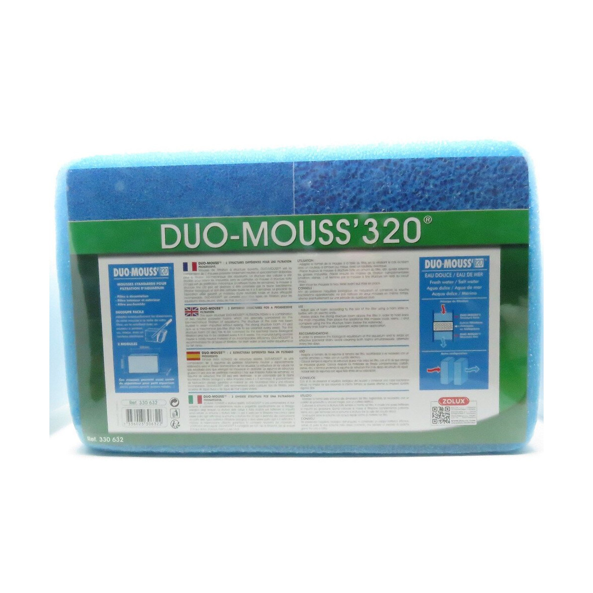 Duo mousse 320. 2 mousses de filtration pour aquarium. Deux mousses de filtration et deux structures de tamis différentes pour la filtration mécanique et biologique de votre aquarium. 2 STRUCTURES DIFFÉRENTES POUR UNE FILTRATION PROGRESSIVE. Mousse de filtration à structure ouverte, DUO-MOUSS® est la combinaison de 2 mousses polyester totalement neutres et spécialement élaborées pour la filtration biomécanique des aquariums. dimension de chaque mousse 31 x 20 x 6.5 cm. Duo mousse 320. 2 mousses de filtration pour aquarium. Deux mousses de filtration et deux structures de tamis différentes pour la filtration mécanique et biologique de votre aquarium. 2 STRUCTURES DIFFÉRENTES POUR UNE FILTRATION PROGRESSIVE. Mousse de filtration à structure ouverte, DUO-MOUSS® est la combinaison de 2 mousses polyester totalement neutres et spécialement élaborées pour la filtration biomécanique des aquariums. La structure des cellules a été étudiée pour retenir les impuretés, sans se colmater. La mousse à structure forte (10 ppi) sert de préfiltration mécanique (à nettoyer toutes les semaines), la mousse à structure fine (30 ppi) est destinée à être colonisée par la faune bactérienne (filtration biologique) et doit être nettoyée toutes les 6 à 8 semaines. Le procédé de fabrication utilisé garantit un matériau d'une neutralité totale et d'une efficacité incomparable. DUO-MOUSS'® est conseillé pour tous types de filtration, pour les aquariums d'eau douce, d'eau de mer, ou pour les viviers. UTILISATION : - Adapter le format de la mousse à la taille du filtre, en la retaillant le cas échéant avec un couteau à jambon ou, mieux, avec un couteau électrique. Placer toujours la mousse à structure forte en amont du filtre, afin qu'elle retienne les grosses impuretés. Placer ensuite les masses de filtration complémentaires (charbon, résines...) et terminer par la mousse à fine structure (en aval du circuit d'eau) - Bien rincer les mousses à l'eau tiède avant leur mise en place. CONSEILS : Afin de préserver l'équilibre biologique de l'aquarium et conserver la souche bactérienne opérationnelle, ne pas nettoyer les deux mousses en même temps, alterner éventuellement sur une période de quelques jours. Photo non contractuelle, car il y a plusieurs vendeurs sur une même fiche produit.
