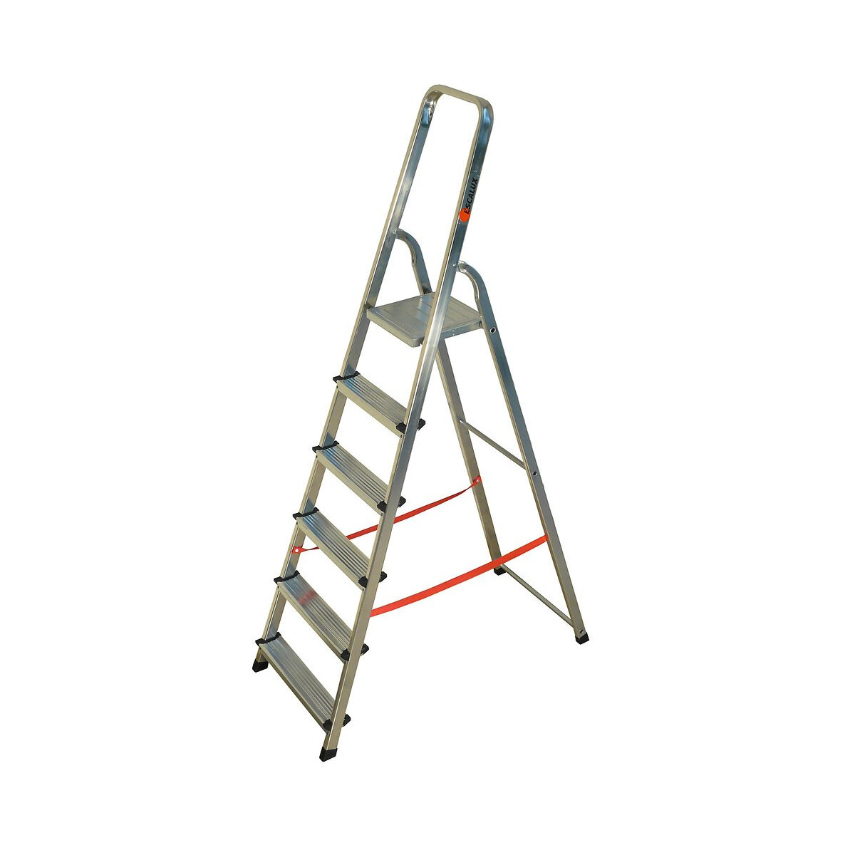 Escabeau Bricoleur Caractéristiques : Structure en Aluminium Plateforme en acier zingué Marches antidérapantes en acier zingué Charge jusqu'à 150 kg, testé à 260 kg Articulations par crosses monoblocs Embouts antidérapants interchangeables Garantie : 3 ans