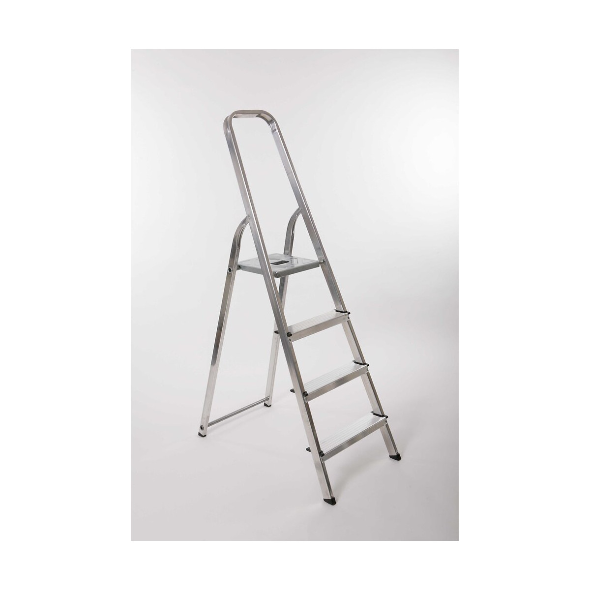 Escabeau ménager 4 marches. Montants avants en acier section 40 x 20 mm, marches antidérapantes rivetées largeur 80mm, montants arrières de section 35 x 20 mm plateforme en aluminium peinte en époxy rouge 25 x 25 cm.Spécifications techniques