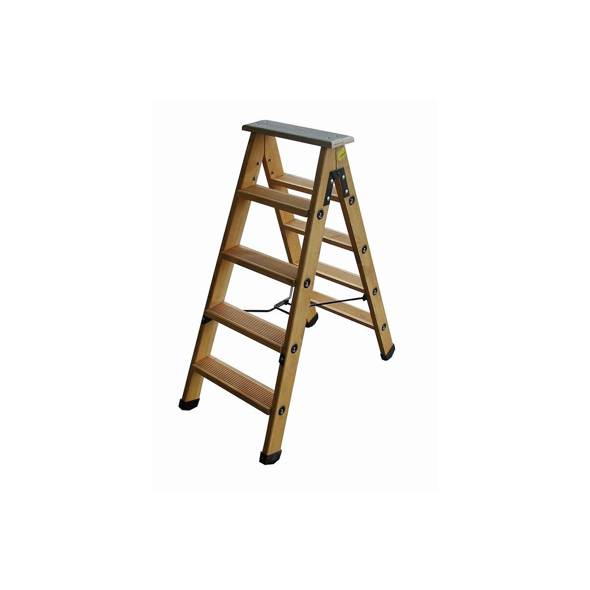 Escabeau à double plans de montée compas rigide, 3 marches + tablette. Tablette de travail antidérapante. Ferrure d'ouverture autobloquante en acier. Marches striées, interchangeables avec renfort métallique pour une plus grande rigidité. Traitement lasure extérieur. Norme EN 131.