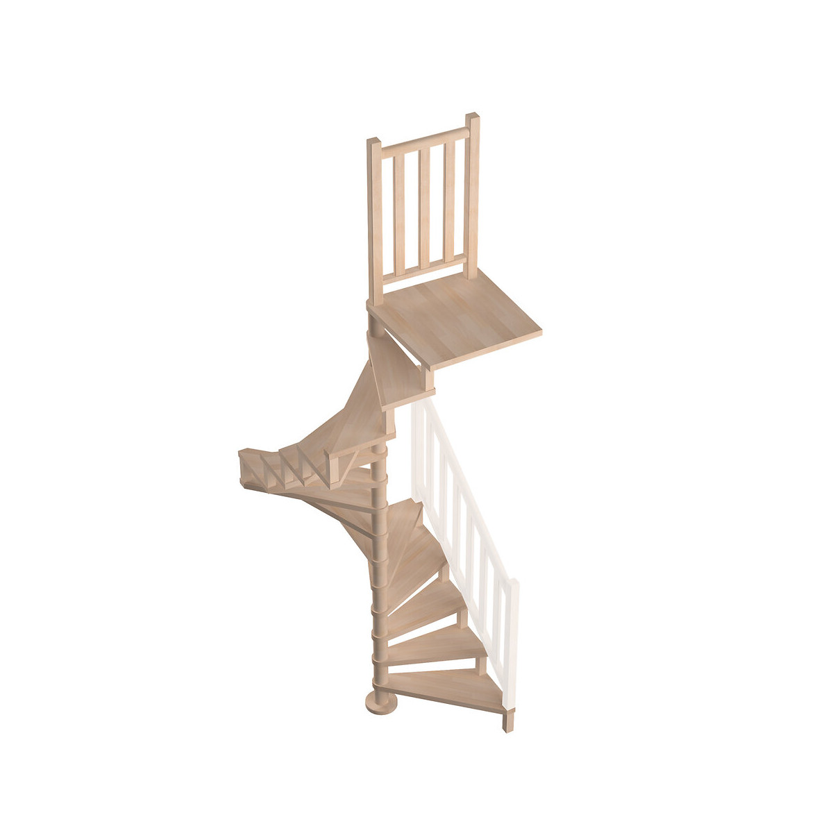 Escalier en spirale en hêtre massif lamellé A placer dans un angle de mur Hauteur arrivé au niveau palier : maximum 300cm 14 marches épaisseur 31mm Entretoises diamètre 110mm + 6 équerres de fixation Fourni avec palier carré recoupable et garde-corps sur palier Ajustable par recoupe de la première entretoise A traiter, vernir ou huiler Livré dans une boîte/palette Usage intérieur