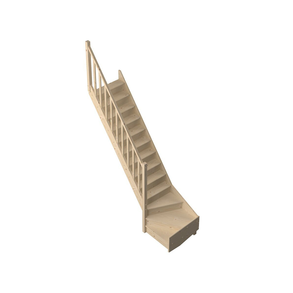 L'escalier TRADI ECO SAPIN 1/4 tournant bas gauche est un escalier classique livré en kit. Celui-ci est composé de 13 marches, 13 contre marches et d'une rampe à balustres moulurés. A peindre ou à huiler. Hauteur sol/sol : 280cm - largeur 80cm sans la rampe et 82cm avec la rampe Profondeur de marche : 19cm - Giron : 16cm.