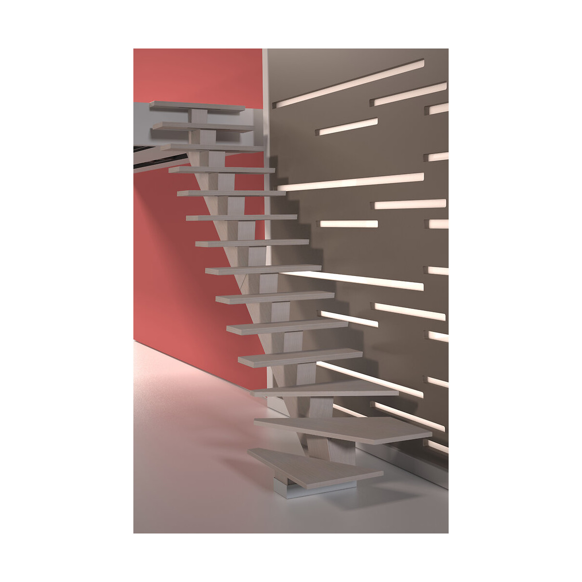 Escalier moderne avec limon central, base panneau contrecollé avec placage massif Version ¼ tournant bas14 marches en chêne avec finition huile Rubio Monocoat Largeur 85cmHauteur sol/sol : de 280, 6 à 305, 6cmTrémie min. 220/90cmRecul : 302cmAssemblage de limons en 2 pièces. Testé en laboratoire du C. S. T. C n° agrégation DE 651 XH 695 2009Couleur de finition Apache Grey