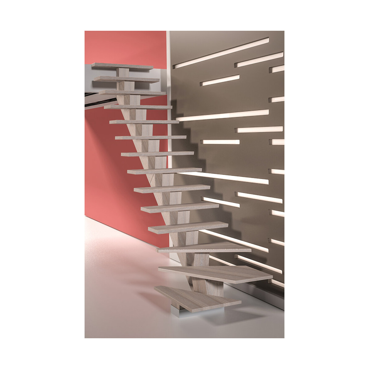 Escalier moderne avec limon central, base panneau contrecollé avec placage massif Version ¼ tournant bas14 marches en chêne avec finition huile Rubio Monocoat Largeur 85cmHauteur sol/sol : de 280, 6 à 305, 6cmTrémie min. 220/90cmRecul : 302cmAssemblage de limons en 2 pièces. Testé en laboratoire du C. S. T. C n° agrégation DE 651 XH 695 2009Couleur de finition Apache Grey