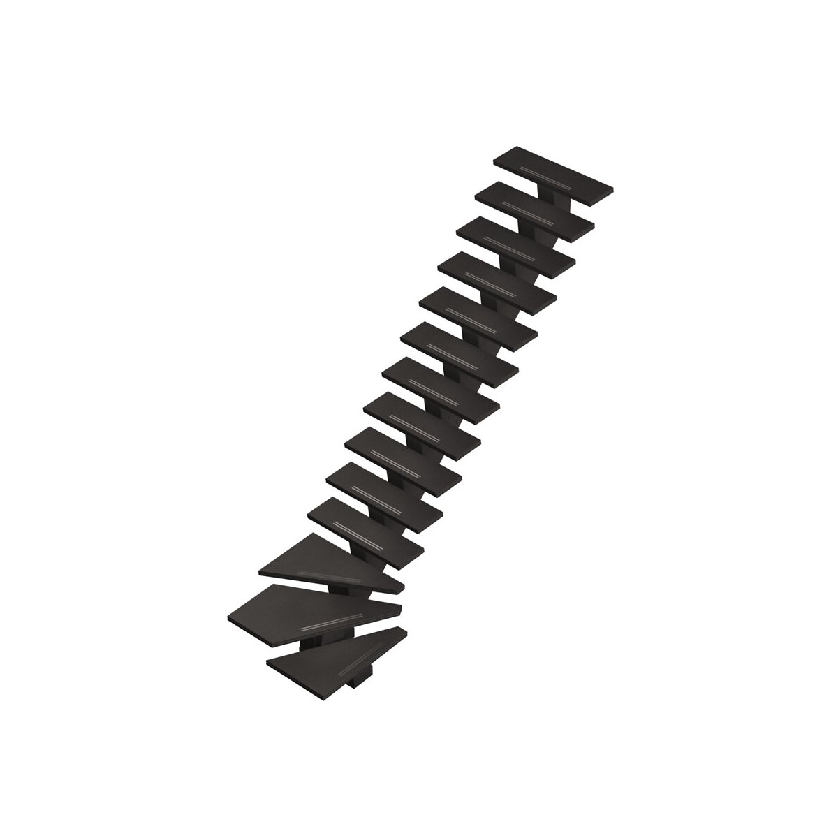 Escalier moderne avec limon central Version 1/4 tournant bas droit Finition huile Rubio Monocoat 14 marches en panneaux de fibre de bois naturel Valchromat, épaisseur 38mm, giron 20cmModèle de marche avec strips aluminium Largeur : 85cmHauteur sol/sol : de 280, 2 à 285, 2cmTrémie min. 220/90cmRecul : 302cmAssemblage des limons en 2 pièces. Testé en laboratoire du C. S. T. C n° agrégation DE 651XH 695