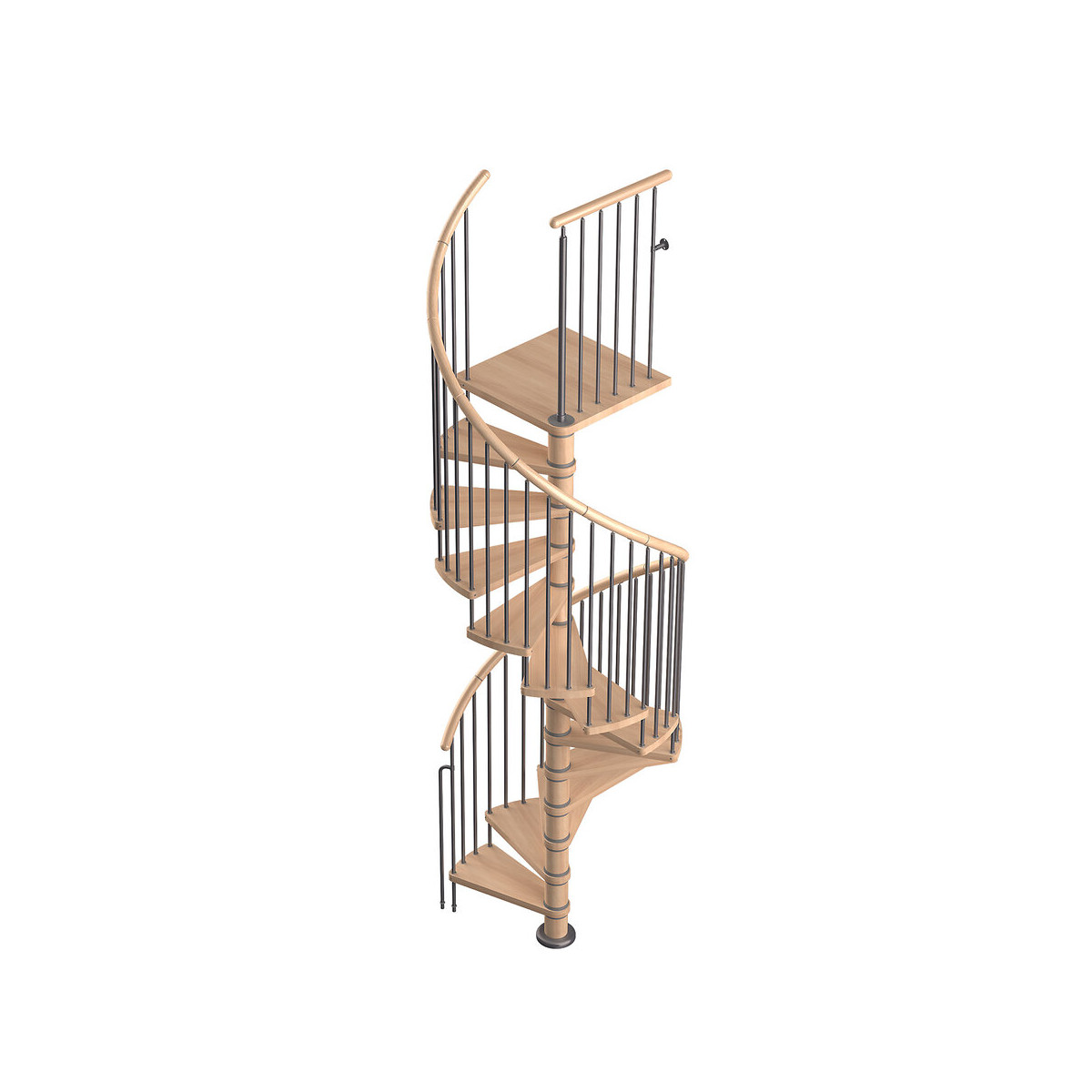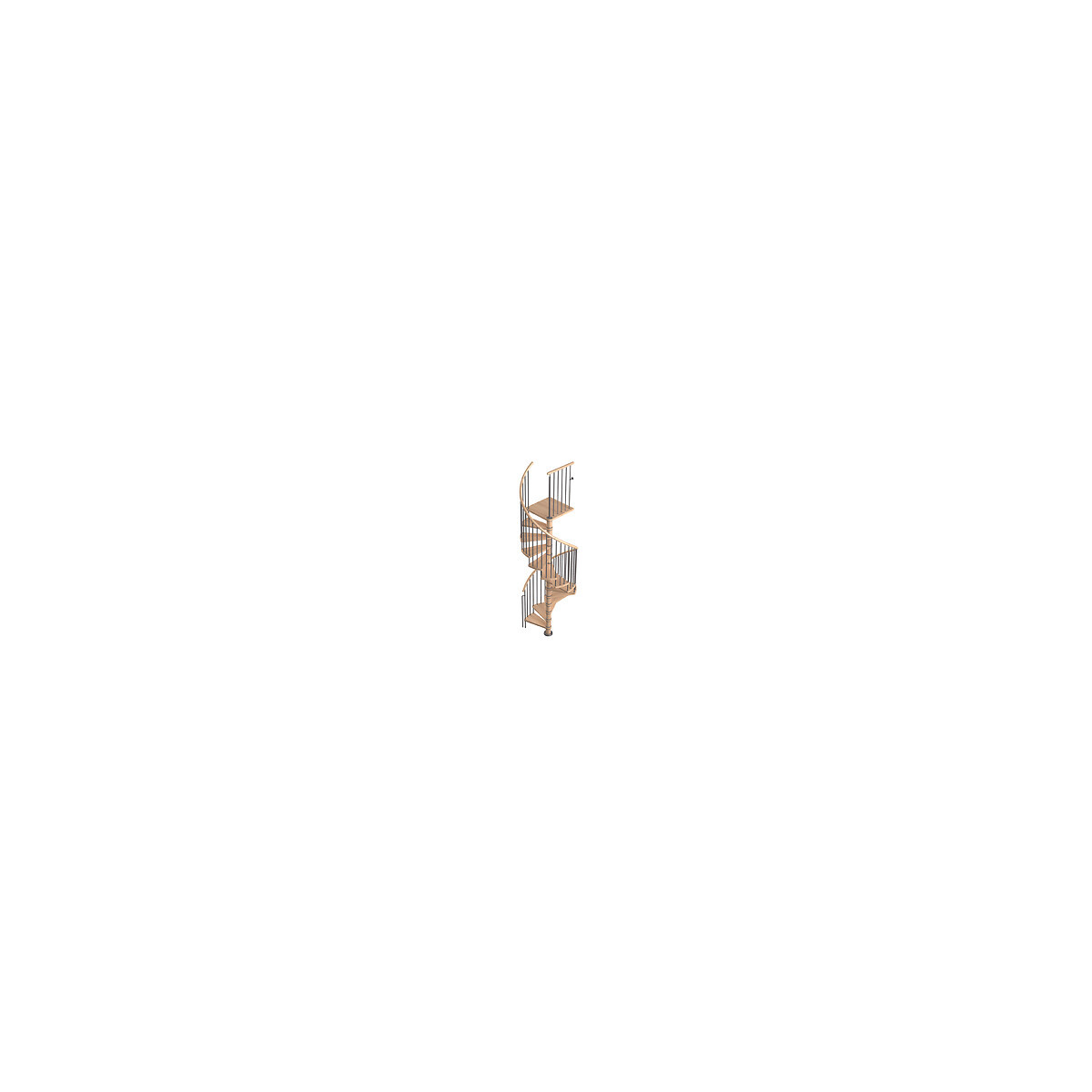 Escalier spirale en hêtre massif teinté et verni Pour trémie ronde ou carrée13 marches réglables en hauteur de 20, 5 à 22, 5cmHauteur arrivée niveau palier : minimum 287cm, maximum 315cm marches, entretoises, main courante et palier carré (recoupable) en hêtre massif teinté et verniRampe à balustres laqué gris Usage intérieur