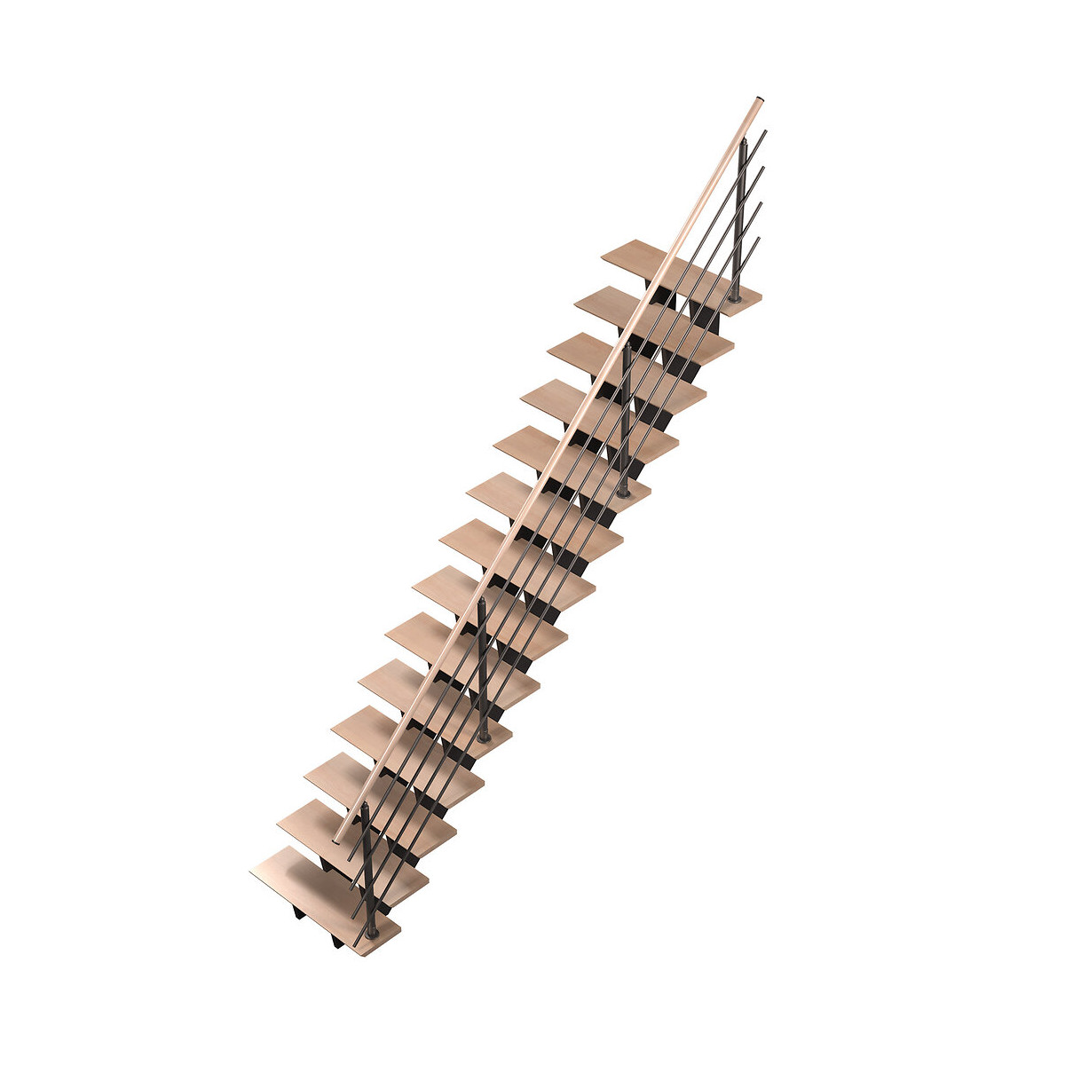 Escalier moderne en kit BIAX en Valchromat et hêtre lamellé Version droite Composé de : 2 limons en Valchromat, finition huile gris anthracite (fourni en 2 pièces sur la longueur) 14 marches en hêtre lamellé 31mm, finition vernis naturel Rampe avec 4 poteaux en aluminium gris mat RAL 7024 et main courante en hêtre diamètre 40mm Usage intérieur