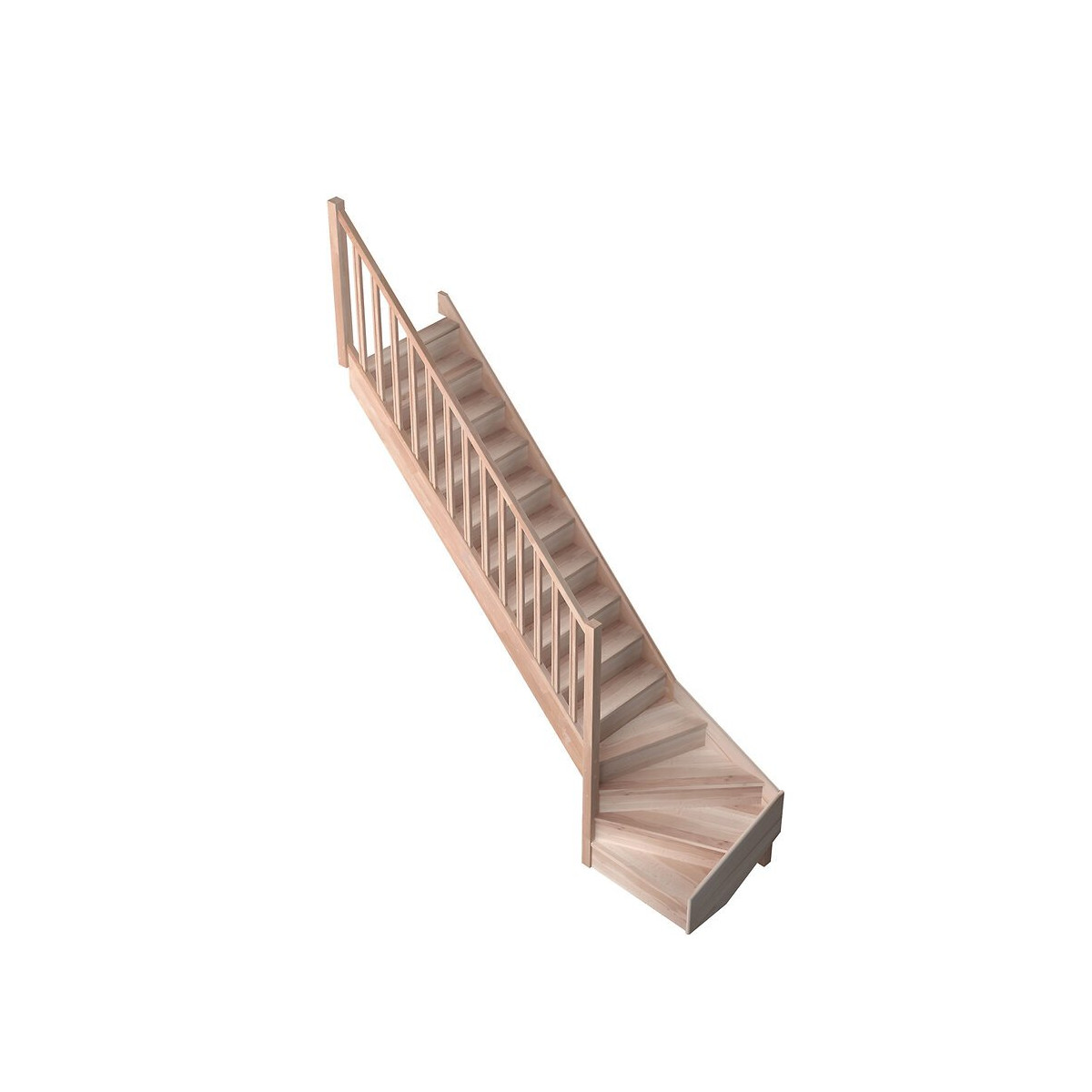 Escalier traditionnel 1/4 tournant en hêtre avec : Rampe à balustres moulurés. Contre marches. 14 marches (dont 1/2 marche palière) . Hauteur sol/sol : 275cm Largeur : 85cm. Hauteur de marche : 19, 5cm. (à monter soi même)