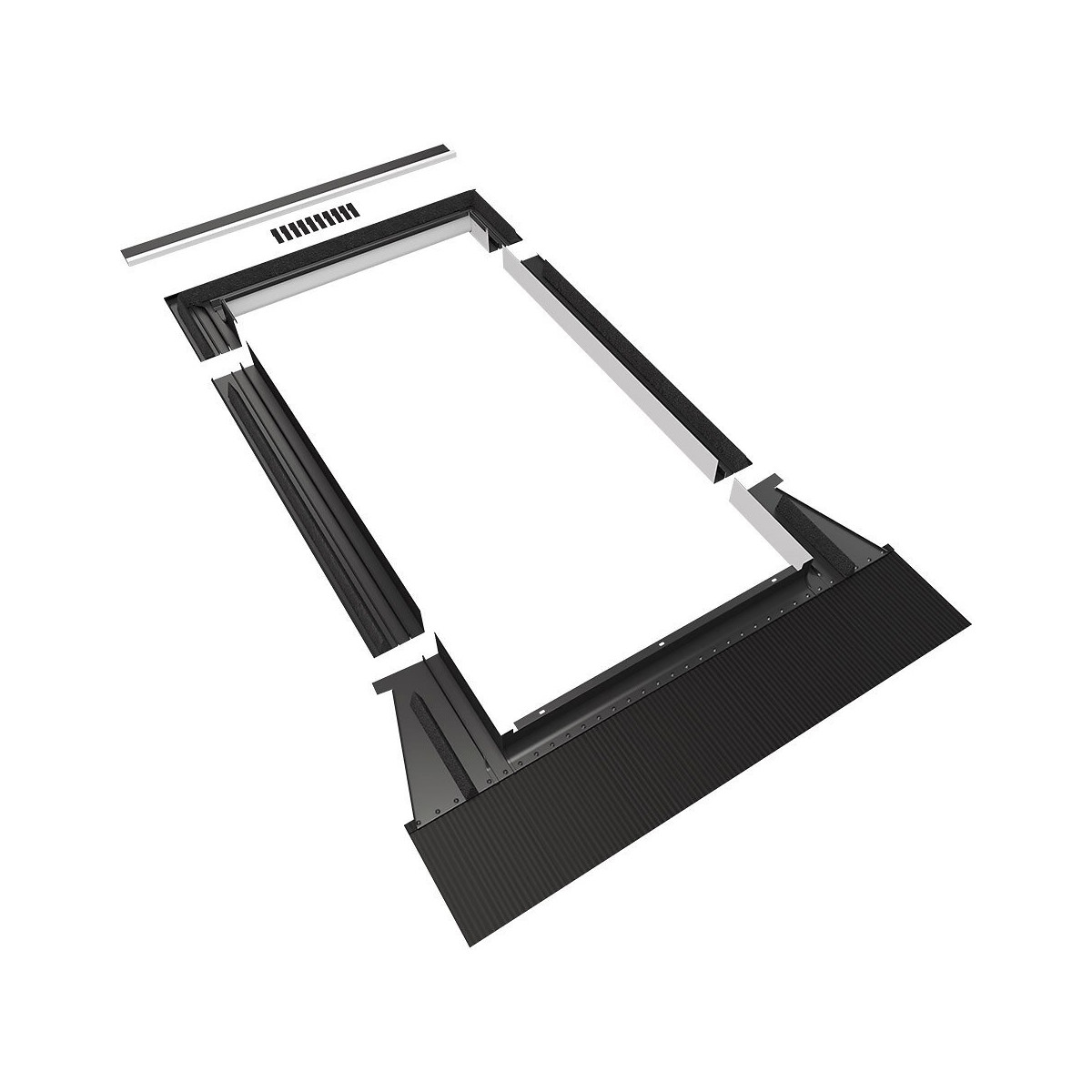 Le raccord EHV-A permet le montage étanche d' une fenêtre dans un toit avec couverture ondulée: tuiles ondulées, tôle ondulée, tuiles mécaniques, tuiles romanes, canal. Ce raccord est prévu pour la pose standard. Construction du raccord : Il se compose d'un élément inférieur avec une bavette en aluminium, d'un élément supérieur et d'éléments latéraux. La bavette inférieure est munie de deux rubans de butyle afin de les coller avec la couverture du toit pour augmenter l'étancheité. Le raccord EHV-A est équipé d'une gouttière qui rejette la condensation de vapeur d'eau accumulée sur le ?lm micro-aéré et une cale en triangle pour régler la hauteur de tuile dans la partie supérieure. Dimensions : 78 x 118 cm Garantie 10 ans