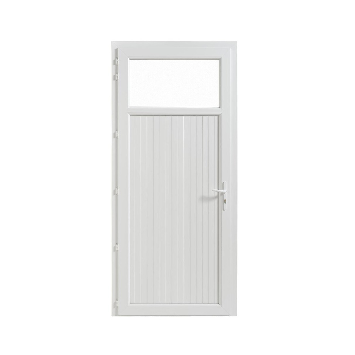 Menuiserie PVC Néo Classic Blanc hauteur tableau 2050m largeur tableau 800mm pose en applique intérieure dormant 5 sans aile seuil alu eco ( Uniquement pour PS ) porte de service Occulus 1 vantail profil Z75 fermeture serrure à barillet sens droite tirant hauteur poignée 1000mm panneau rainuré vertical isolé Blanc 24mm vitrage 4/16/4 clair LowE