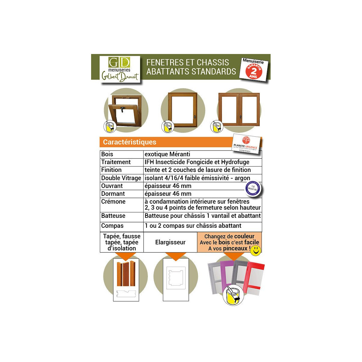 FENETRE 2 VANTAUX EN BOIS - PRET A ETRE PEINT OU TEINTER -COTE TABLEAU : HAUTEUR 135 X LARGEUR 140 - COTE HORS TOUT : H 137,6 x L 145,3 cm - VITRAGE 4/16/4 FE + ARGON - POIGNEE NON FOURNIE Dormant et ouvrant de 46mm d'épaisseur; vitrage 4/16/4 faible émissivité avec gaz argon Ces menuiseries reçoivent en usine un traitement FIH: Fongicide, Insecticide, Hydrofuge, contre champignons, moisissures, insectes xylophages et humidité ce premier traitement doit recevoir obligatoirement 2 couches de finition après la pose pour assurer une bonne protection. Faire par la suite un entretien régulier Faire par la suite un entretien régulier Vous pourrez également peindre votre fenêtre de la couleur de votre choix pour l'assortir à votre maison. Le Groupe de GD Menuiseries adhère à PLANETE URGENCE et participe à l'opération 1€ = 1 arbre planté