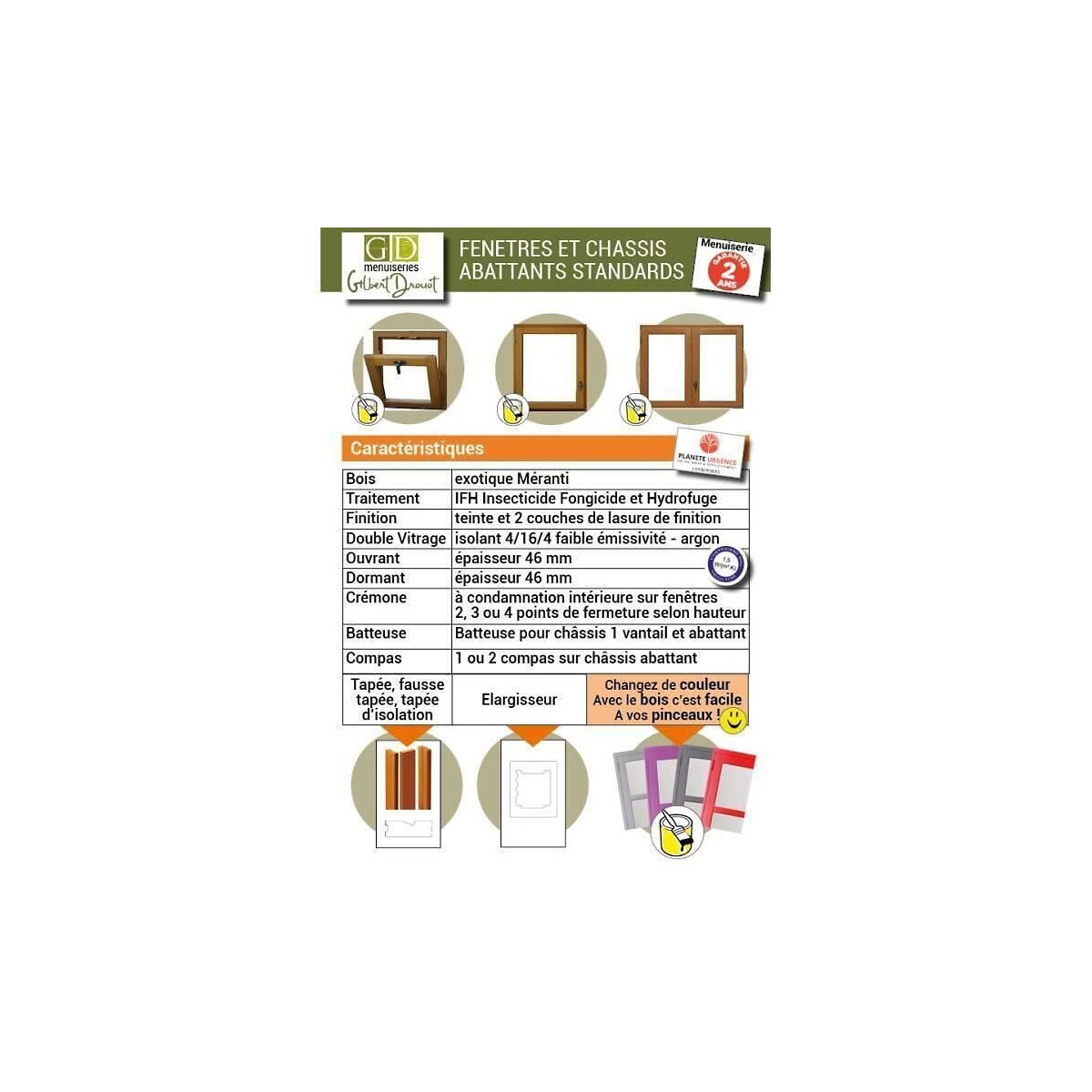 FENETRE 3 VANTAUX EN BOIS - PRET A ETRE PEINT OU TEINTER -COTE TABLEAU : HAUTEUR 125 X LARGEUR 180 - COTE HORS TOUT : H 127,6 x L 185,3 cm - VITRAGE 4/16/4 FE + ARGON - POIGNEE NON FOURNIE Dormant et ouvrant de 46mm d'épaisseur; vitrage 4/16/4 faible émissivité avec gaz argon Ces menuiseries reçoivent en usine un traitement FIH: Fongicide, Insecticide, Hydrofuge, contre champignons, moisissures, insectes xylophages et humidité ce premier traitement doit recevoir obligatoirement 2 couches de finition après la pose pour assurer une bonne protection. Faire par la suite un entretien régulier Faire par la suite un entretien régulier Vous pourrez également peindre votre fenêtre de la couleur de votre choix pour l'assortir à votre maison. Le Groupe de GD Menuiseries adhère à PLANETE URGENCE et participe à l'opération 1€ = 1 arbre planté