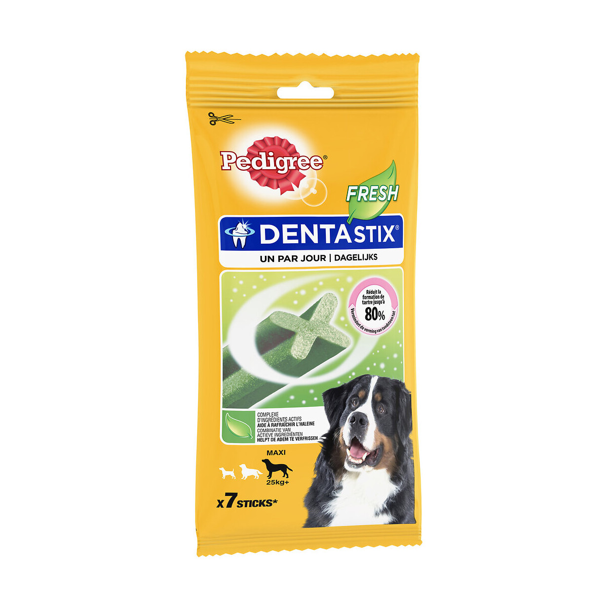 4 chiens sur 5 de plus de 3 ans ont des problèmes bucco-dentaires. Ils sont causés par le développement de la plaque dentaire et du tartre. Une bonne hygiène bucco-dentaire représente le meilleur moyen de les réduire. Les bâtonnets à mâcher Pedigree DentaStix fresh vous aident à garder les dents et les gencives de votre chien en bonne santé et l'aident également à garder une haleine fraîche.Les produits Pedigree DentaStix fresh contiennent de l'huile d'eucalyptus et des extraits de thé vert qui aident à rafraîchir l'haleine du chien. En utilisation quotidienne, ces bâtonnets en forme de X aident à réduire jusqu'à 80% la formation de tartre, grâce à leur texture spéciale et aux ingrédients actifs.Pedigree DentaStix fresh est également faible en matières grasses, sans sucres ajoutés, sans colorant ni arôme artificiel.Paquet de 7 sticks. Faible en matières grasses, sans sucres ajoutés, sans colorant ni arôme artificiel.