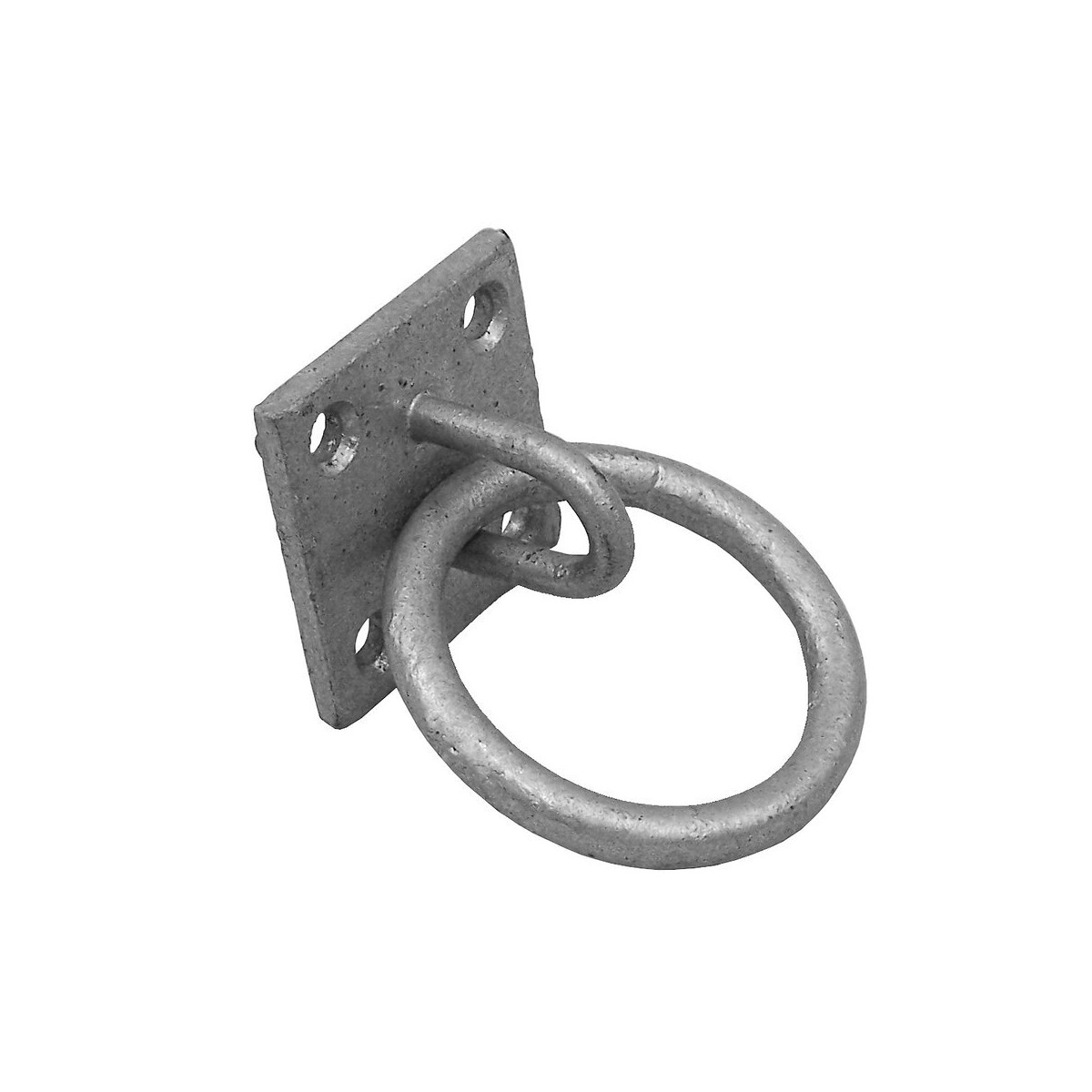 Anneau à platine à fixer. Dimensions de la platine : 5 cm x 5 cm. Diamètre des trous de fixation : 6 mm. Diamètre intérieur de l'anneau : 50 mm. Diamètre du fil : 8 mm. Charge maximale : 200 kg. Marque : VISO