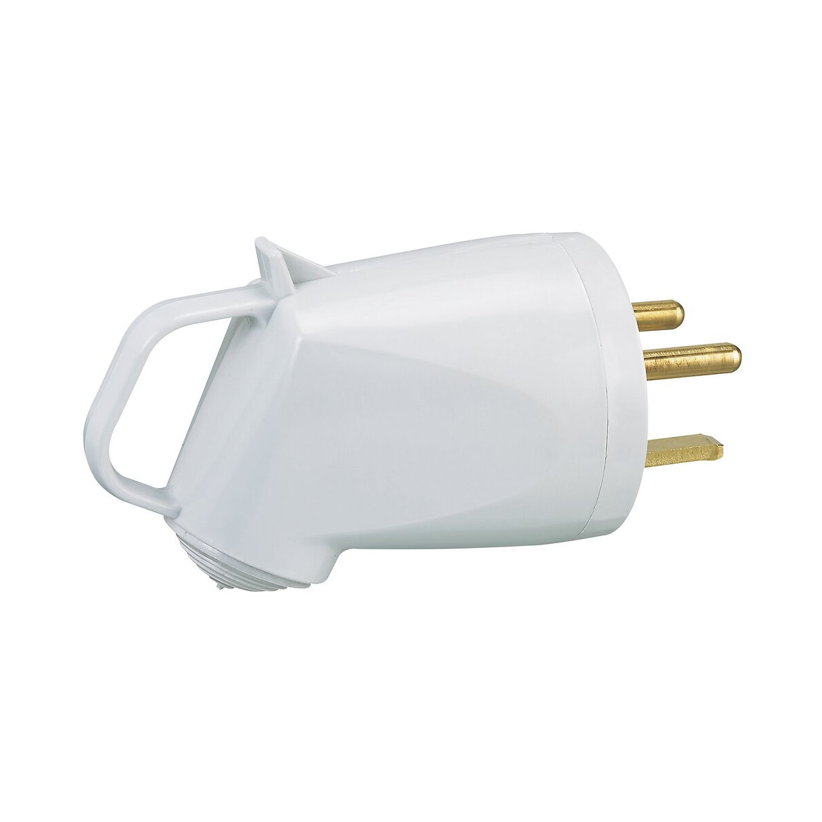 Fiche de puissance mâle avec terre 32A - avec anneau - 2 broches - gris. Fiche permettant le raccordement d'un câble sur une prise de courant ou une fiche femelle.