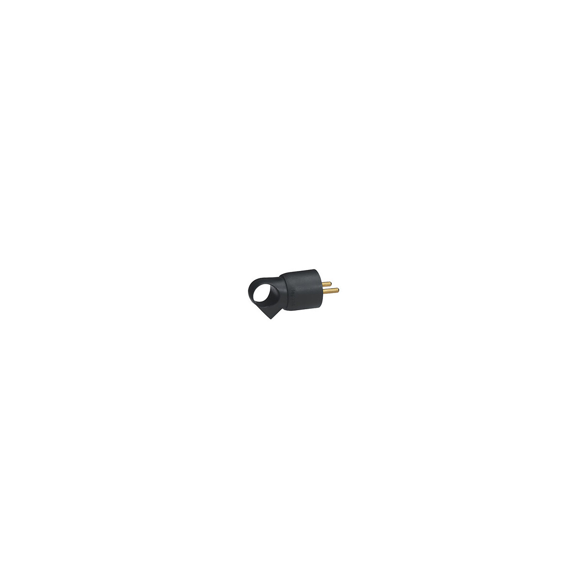 Fiche plastique 2P+T 16A à anneau avec étiquette avec Gencod - noir. Fiche avec anneau pour une meilleure tenue lors du débranchement de la fiche du mur. A installer avec un câble 3x2,5mm² maxi. Serre-câble à vis. Pour branchement sur prises murales 2P et 2P+T. Couleur noire. Serre câble a vis pour une meilleure tenue.