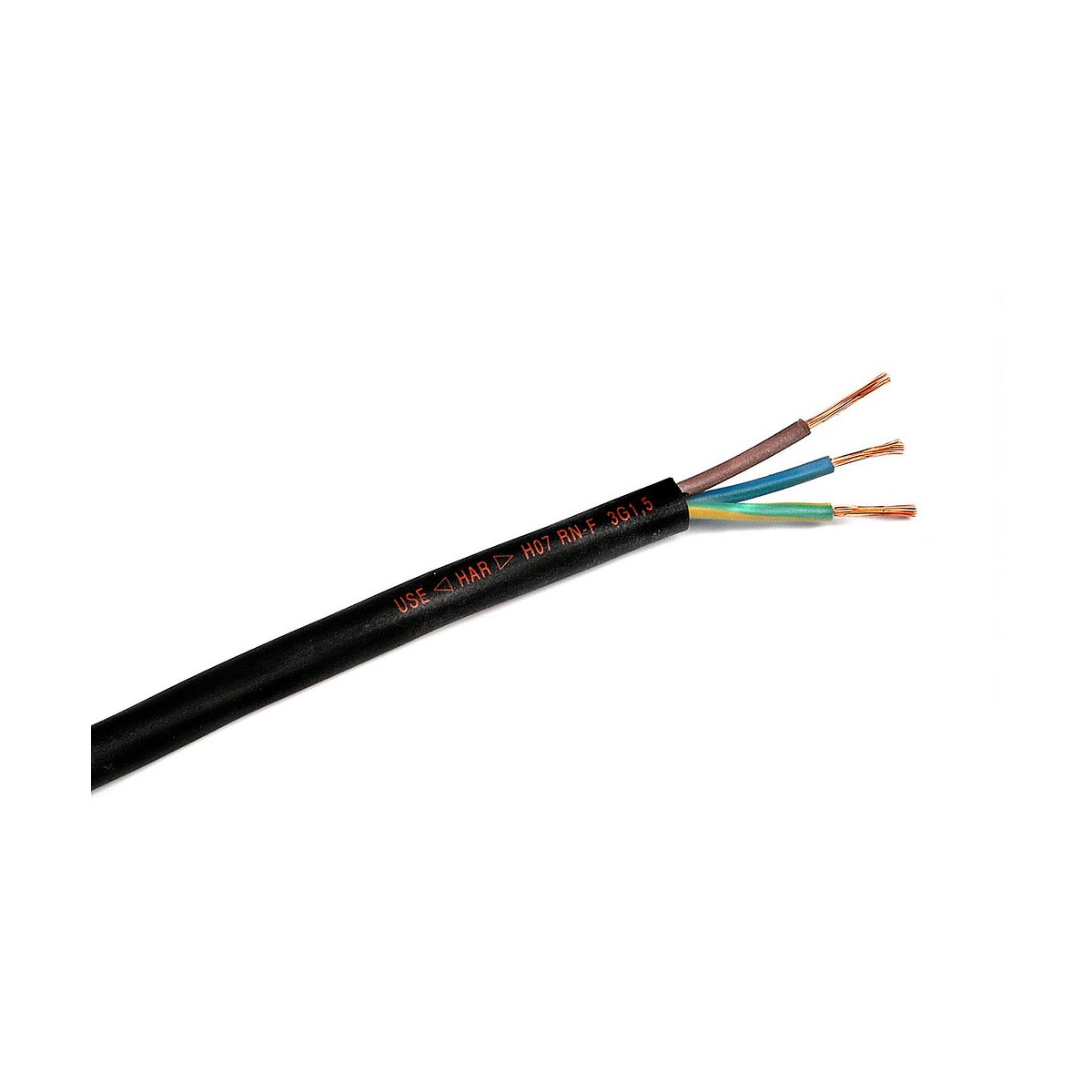 Ce câble électrique H07RN-F est adapté pour le raccordement des appareils à l'intérieur et à l'extérieur (à l'air libre). Câbles ronds de 3 conducteurs extra souples et résistants aux variations de température. Pour cordons d'alimentation ou raccordement des appareils électroménagers , outils électroportatifs et équipements de chantier, appareils de chauffage, prolongateurs, enrouleurs... Résiste aux températures élevées, au froid, à l'écrasement, aux projections d'eau, etc. Pour équipement de chantier avec terre jusqu'à 3680 W (perceuse, disqueuse...) Longueur : à la coupe Type de la série : Harmonisée (H) Type tension : 450/750 V (07) Section du câble : 1,5 mm² Enveloppe isolante : Caoutchouc vulcanisé (R) Type de câble : Rigide, câblée, ronde (R)- souple classe 5 (F) Coloris : Noir