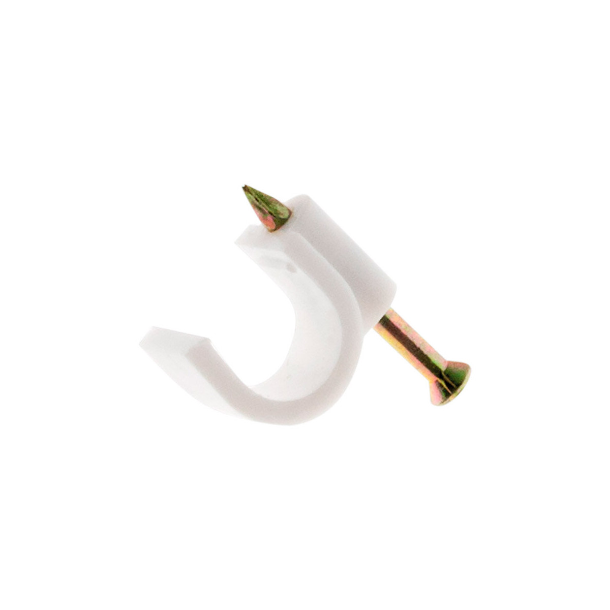 Lot de 100 attaches ou crochets de fixation blancs pour fil de diamètre 7mm avec clou spécial béton. Convient particulièrement aux câbles TV. Ces crochets permettent de fixer des câbles et autres gaines au mur. Certifié CE.